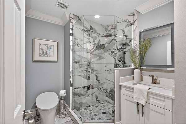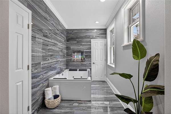 - Ceiling Fans(s), Crown Molding, Eat-In Kitchen, High Ceilings, Primary Bedroom Upstairs, Stone Counters, Thermostat, Walk-In Closet(s)