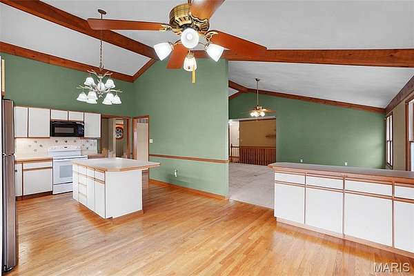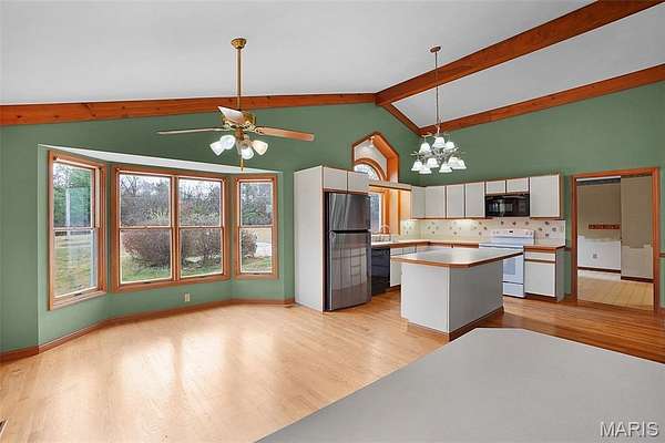 - Beamed Ceilings, Ceiling Fan(s), Double Vanity, Eat-In Kitchen, Entrance Foyer, Kitchen Island, Kitchen/Dining Room Combo, Laminate Counters, Pantry