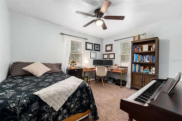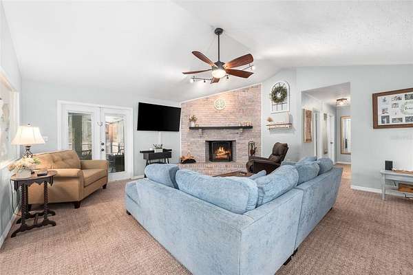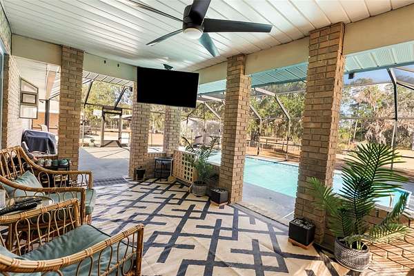 The main brick home offers an expansive 2,731 SF with 4 bedrooms, 2.5 bathrooms, an office/study enclosed by a custom barnyard door, and an additional bonus/flex room. Interior highlights include a formal dining room, wood-burning fireplace, luxury vinyl flooring throughout living area, and a spacious primary suite with a whirlpool tub. Outdoor living shines with a screened-in, sparkling saltwater pool featuring a new pump installed in 2025, along with a covered lanai and pool patio ideal for entertaining or relaxing.