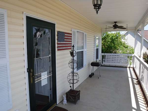The approach to the home is framed by a lush front lawn, kept vibrant year-round by a dedicated irrigation system. The centerpiece of the exterior is the extra-wide front porch, featuring two swinging loveseats—the ultimate spot for morning coffee or evening relaxation.