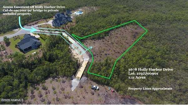 Take Southport Supply RD (Rt. 211) to south on EF Middleton RD (906) then left onto Seafield DR through the St. James Plantation Seaside gate then right onto Pine Forest Rd. Continue to right turn onto Parkridge DR. After crossing a covered bridge take right onto Holly Harbor DR. Continue to end cul-de-sac. Entrance to right away/access easement is on right.
