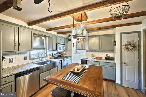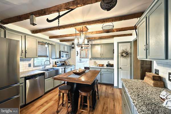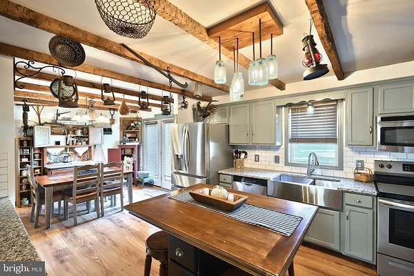 - Breakfast Area, Ceiling Fan(s), Country Kitchen, Dining Area, Entry Level Bedroom, Exposed Beams, Family Room Off Kitchen, Formal/Separate Dining Room, Island Kitchen, Open Floor Plan, Pantry, Recessed Lighting, Table Space Kitchen, Tub Shower Bathroom, Walk-In Shower Bathroom, Wood Floors