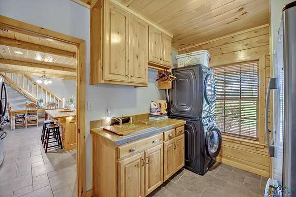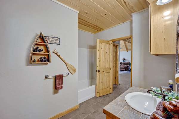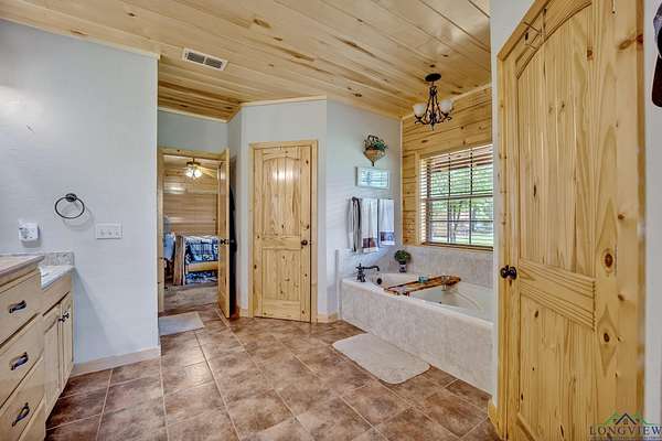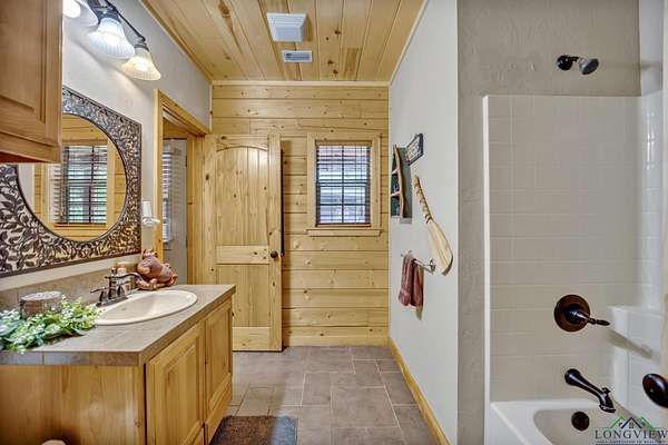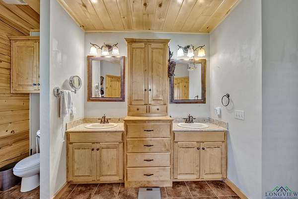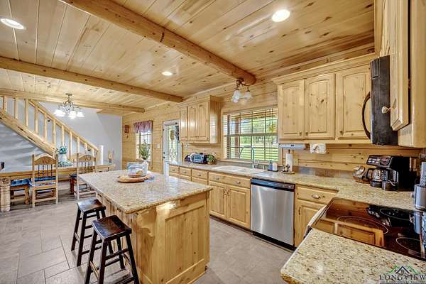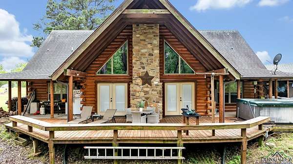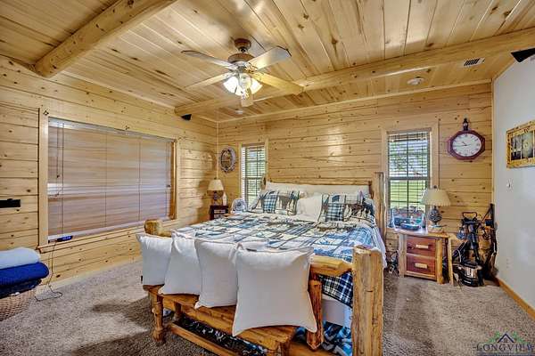 This beautiful Satterwhite log home has 4/4/2, 2604sf and sits on +/-3.5 acres in Union Hill ISD. The home features a large kitchen, spacious living room and a large primary bedroom. In the kitchen, you will find custom cabinets with lots of storage space, granite counter-tops and plenty of space for all your cooking needs. The living room features a wood burning fireplace, vaulted ceilings and plenty of room for movie or game night. The primary bedroom features gorgeous wood ceilings and a large en suite. In the en suite, you will find a tiled walk-in shower, soaker tub, double vanities and two walk in closets. The upstairs features 2 bedrooms with their own full bathrooms and a bonus space between the bedrooms. Step outside on the huge covered deck and enjoy the view, entertain friends/family or take in the peace and quite. Other features include a wrap around porch, workshop with electric, bonus room with electric and window ac unit, Space for an RV with its own septic tank and a rv hook up. NEW ROOF in 2025!