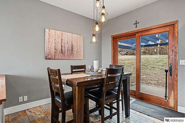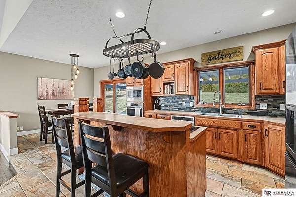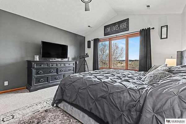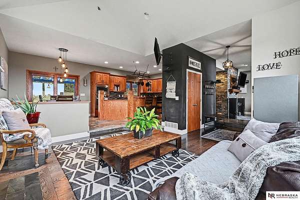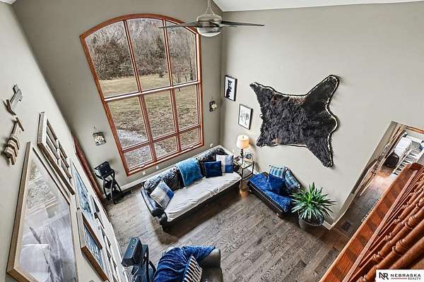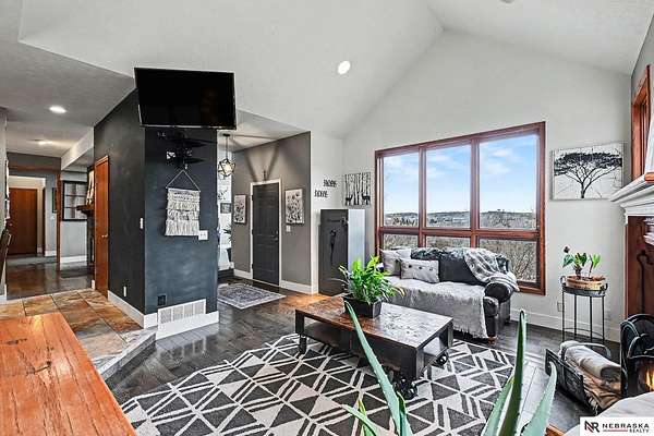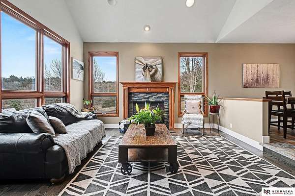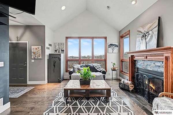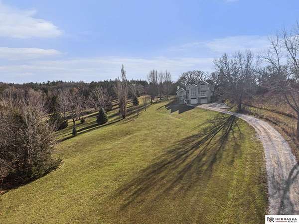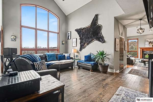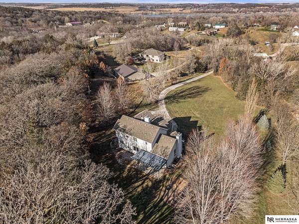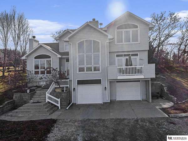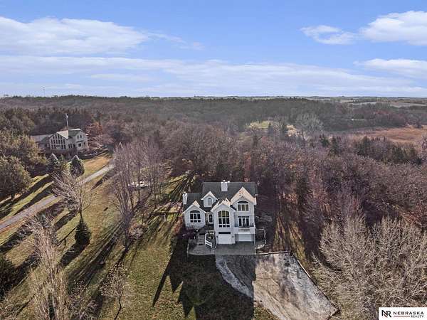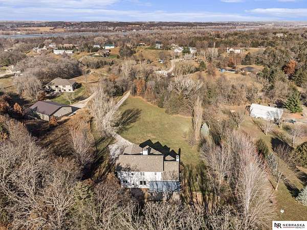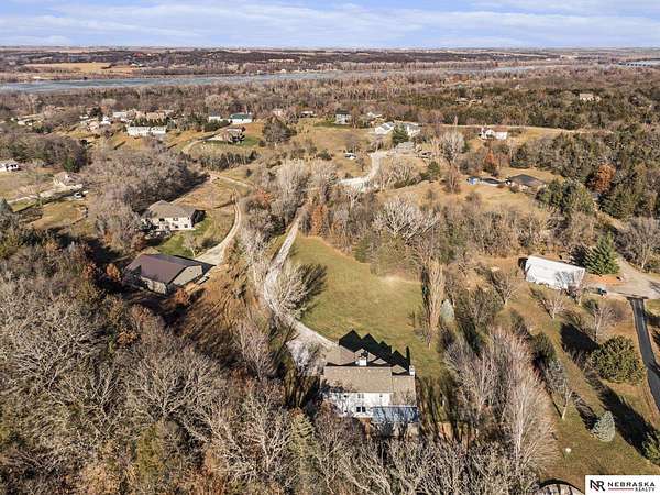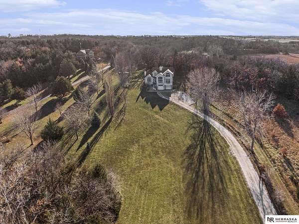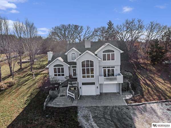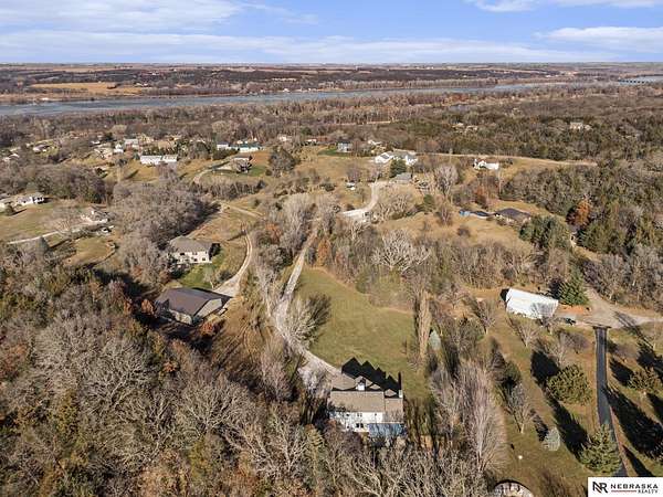 David Matney, M: 402-490-6771, davidmatney@nebraskarealty.com, https://www.nebraskarealty.com - Set on 2.77 acres with elevated views of the river, this custom PRE-INSPECTED home delivers space, light, and privacy in a setting that feels removed--yet remains easily accessible just off Highway 50. Inside, floor-to-ceiling windows and soaring ceilings frame the landscape and flood the home with natural light. The layout offers over 3,000 square feet, anchored by a chef's kitchen, expansive living spaces, and three fireplaces that add warmth and architectural presence throughout. Glass French doors connect the interior to the outdoors, where mature trees, a garden area, and a dedicated firepit create multiple places to relax or entertain. The acreage provides separation from neighbors without sacrificing convenience. Located on the rolling hills near three nearby state parks, this home combines thoughtful design, quality finishes, and a setting that's increasingly hard to find.
