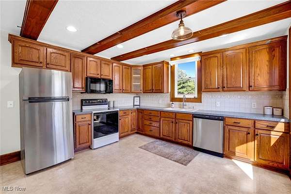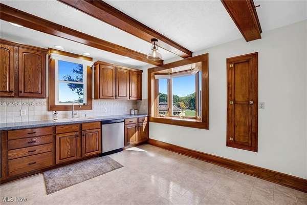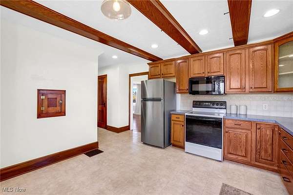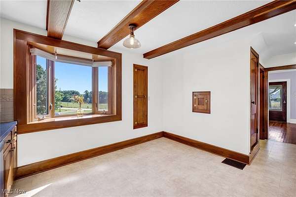 - Beamed Ceilings, Built In Features, Ceiling Fans, Eat In Kitchen, High Ceilings, Natural Woodwork