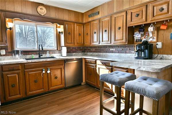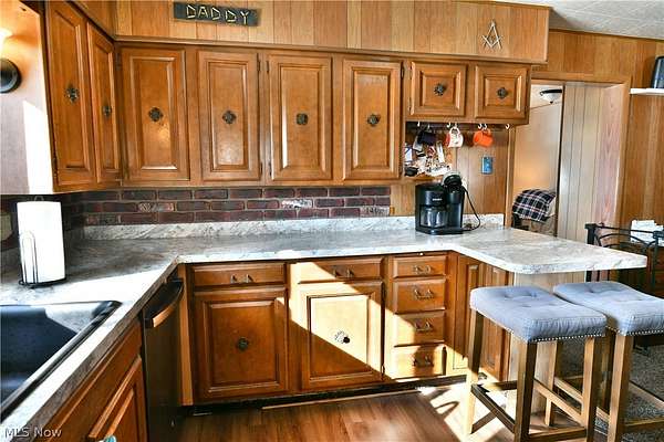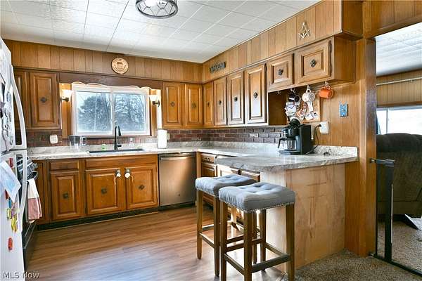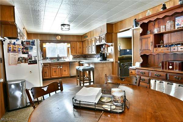 Over twenty-four available acres, a massive outbuilding garage and a cozy, country ranch, what's not to love! Welcome home to your own slice of heaven with this darling Corland estate. The potential is as great as the curb appeal here, boasting an eye catching, gated front patio area and bold red accent colors as the driveway stretches back to find the impressive garage space with three separate garage doors that allow for extended height access. The plot of land follows the near tree line into the outstretched fields behind and again deep into the far woods. A perfect sanctuary for farming, livestock, sporting, or growth. Both a formal front entry and casual rear entrance bring you inside, with the former providing a great mud room with laundry services nearby along with instant basement access. The long stretching, central kitchen and dining rooms are wrapped in warm, wood paneling with plenty of matching accent work that continues throughout the residence. Sunshine pours across the stone-look countertops before warming the carpeted flooring of the dining area. Meanwhile, a forward living room enjoys a large picture window and scenic front yard views. Down the main hall, four sizeable bedrooms branch away to include substantial closet space. They are joined by a deep-set full bath and its quaint vanity. Make your country dreams come true, call today!