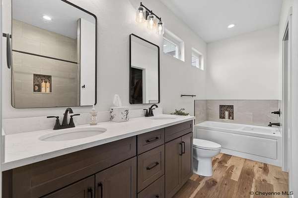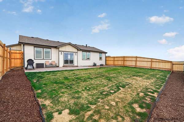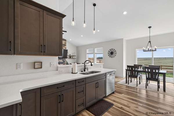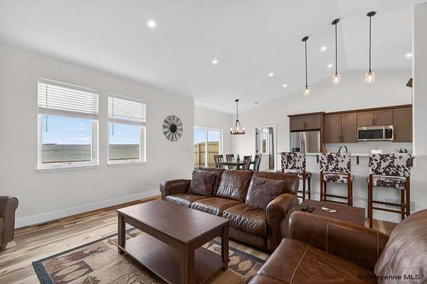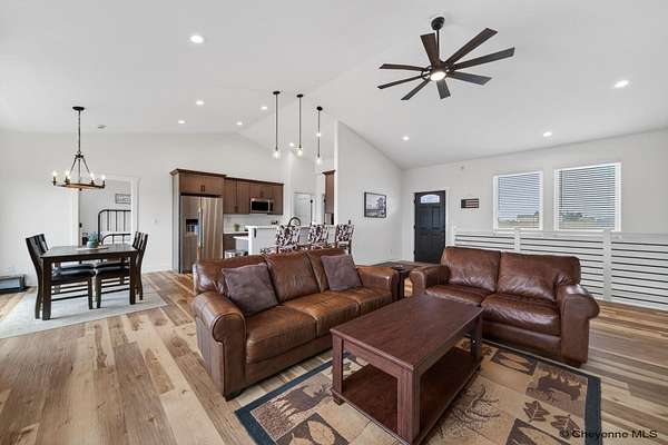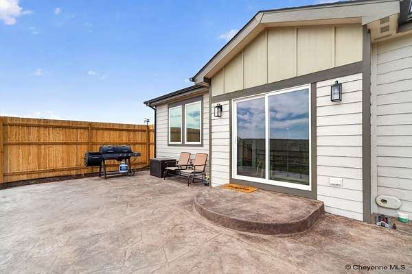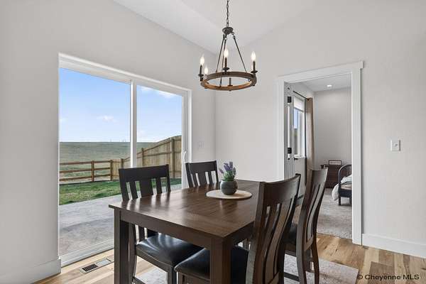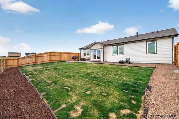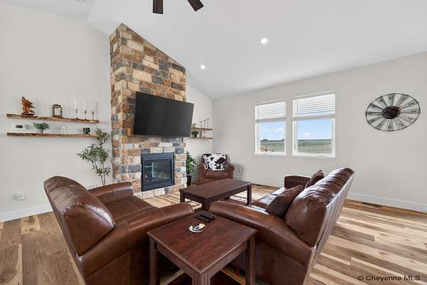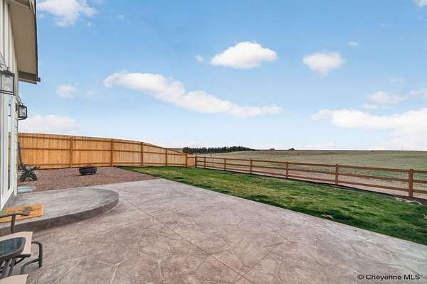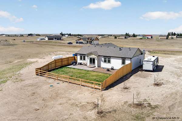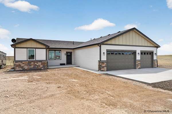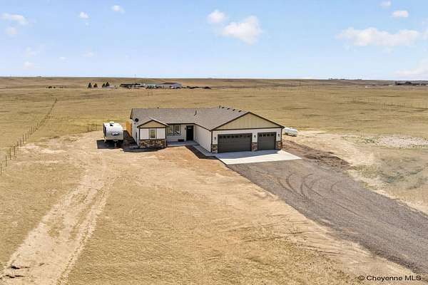 Welcome to Wyoming living on 5.72 acres. This 2025-built home offers the perfect blend of modern finishes and rustic character. Rural living and just 15 minutes from major shopping. Inside, you’ll find 3 bedrooms, 2 bathrooms, and a warm, inviting design with luxury vinyl plank flooring, quartz countertops, and custom touches throughout. The vaulted living room features a floor-to-ceiling stone gas fireplace that brings a true country feel to the space. The oversized 27 X 33, 3-car garage with 10-foot ceilings and 8ft garage doors provides plenty of room for vehicles, equipment, and all that comes with Wyoming living. The property is fully fenced at the perimeter, with an additional fenced backyard featuring sod, landscaping, and a beautifully finished stamped concrete patio—creating a perfect space to relax or entertain while enjoying the wide-open surroundings.