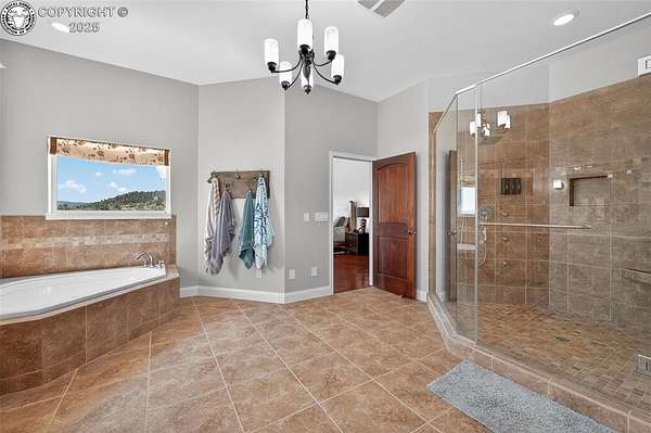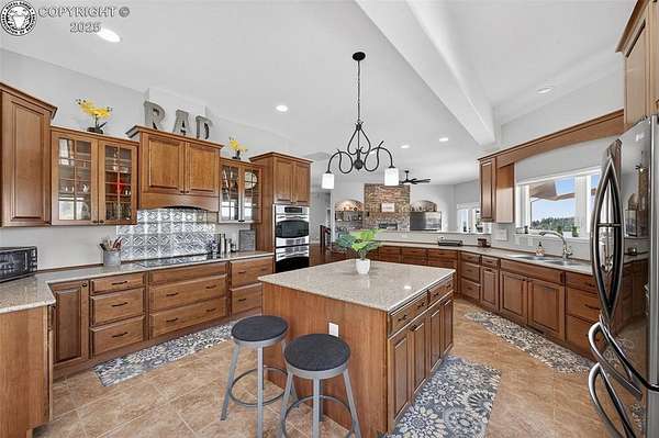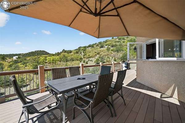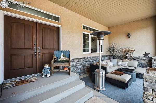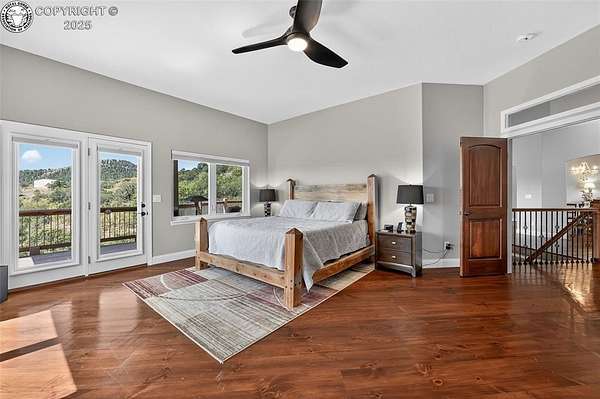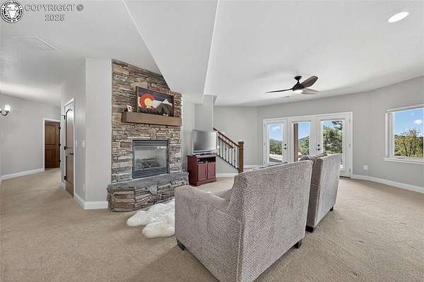 Truly One-of-a-Kind Luxury in a Gated Community! Welcome to this exceptional ranch-style home with a walk-out basement and bonus 800 sq ft loft-offering over 6,000 square feet of thoughtfully designed living space. Nestled in an exclusive gated community, this stone and stucco residence combines elegance with comfort and efficiency, including fully paid roof-mounted solar panels and maintenance-free eaves and soffits. Step inside to be greeted by warm pine plank flooring, quartz countertops, and upgraded maple cabinetry with stunning glass-front display doors in the chef's kitchen and adjacent oversized butler's pantry. Natural light floods the home through expansive windows, framing breathtaking views from nearly every room.The main level features a spacious office with French doors and custom built-ins, the living room a grand stone fireplace flanked by shelves and a generous hearth, and access to the composite deck from multiple rooms-including direct access from the primary suite to your private hot tub retreat.With 4 bedrooms, 3.5 baths, and generous living and entertaining spaces on both floors-including a second stone fireplace in the basement-there's room for all. The custom-designed master closet offers high-end organization reminiscent of "California Closets," while the wine cellar with built-in racks is ready for your collection.The oversized 2-car garage leads to the unfinished 800 sq ft loft, perfect as-is for storage or ready to be transformed into additional living space, a studio, or guest quarters. Come experience the craftsmanship, upgrades, and lifestyle this home offers-you truly won't find another like it!
