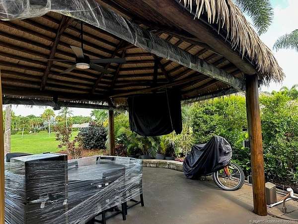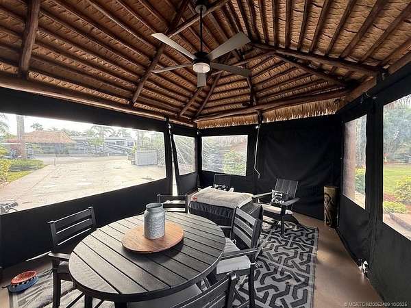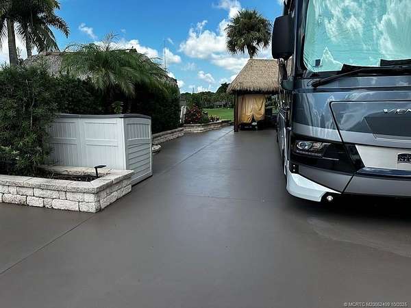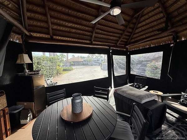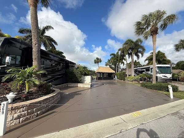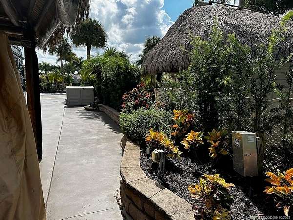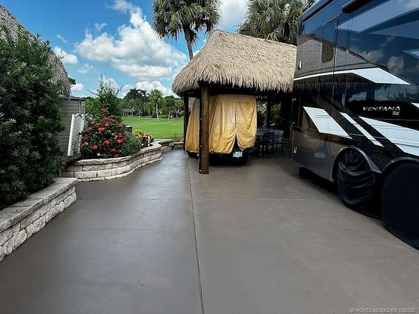 This beautifully landscaped tiki lot offers breathtaking sunset views overlooking the golf course, with a putting green directly behind for your practice sessions. Located on one of the most desirable streets in the resort, it's just a short walk to the main clubhouse, pool, sports facilities, and one of the three fenced-in dog parks. The lot features raised garden beds, mature landscaping, and a newly installed artificial thatch roof on the tiki structure. Sale price includes all furnishings, a refrigerator, and convenient storage units, making this a turnkey opportunity for your next getaway. For those seeking more privacy from the golf course or neighbors, there's portable custom black out curtains for inside the tiki. The evening sunsets over the golf course are spectacular! Don't miss your chance to own a prime spot in this vibrant community!