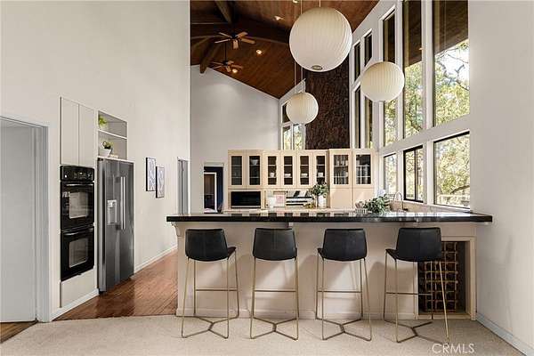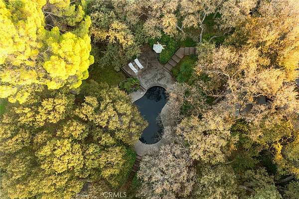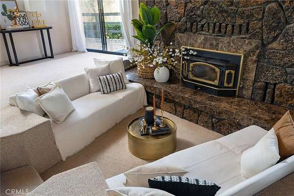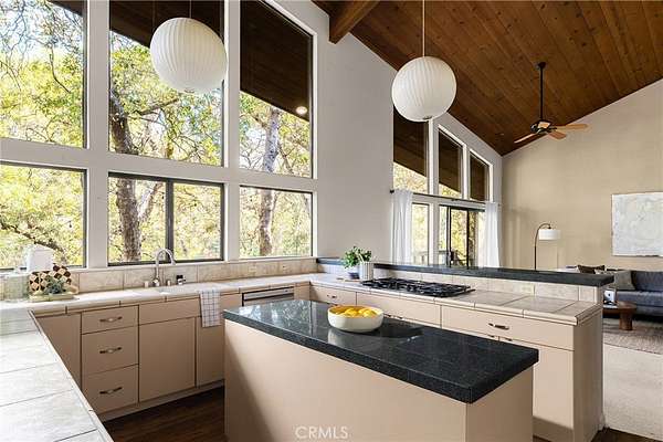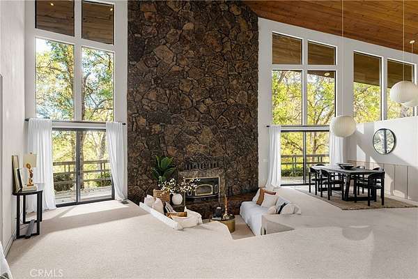 Step through the solid mahogany door into a grand marble-tiled entryway where warm wood-beamed ceilings and a sunken living area create an atmosphere of timeless sophistication. The vintage George Nelson bubble lamps, floor-to-ceiling rock backdrop framing the wood-burning stove, and open concept design embody true mid-century minimalism--refined, organic, and effortlessly modern.