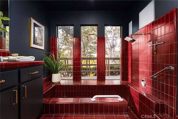 The primary retreat is a sanctuary of light and calm, featuring a spacious walk-in closet and a sleek, modern ensuite with striking burgundy tile and a step-down tub that frames a serene view of the outdoors. Enjoy low energy bills with oversized 16kw's of OWNED SOLAR!!