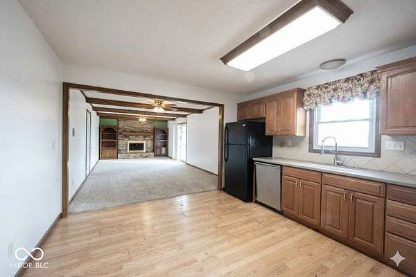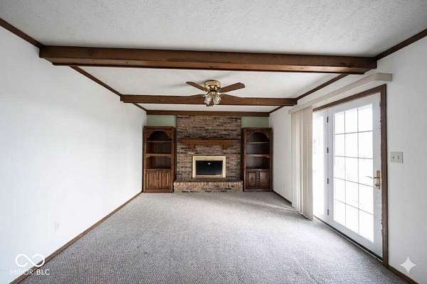 Welcome to 3695 W 100 N in Greenfield - an inviting single-family home nestled on a spacious 1.6 acre lot in Hancock County. Step into the living room, where a cozy fireplace sets the stage for relaxing evenings, complemented by a beamed ceiling that adds architectural character and an open, airy feel. Built-in shelving offers both practical storage and a perfect place to showcase books, photos, and treasured decor, while crown molding adds a subtle touch of elegance throughout. The kitchen is thoughtfully equipped with a gas stovetop, built in wall oven, and backsplash, providing a functional and comfortable space for everyday meal preparation. Outdoors, enjoy multiple spaces designed for relaxation and entertaining, including a patio, porch, and a charming pergola that creates a shaded retreat. With three bedrooms and two full bathrooms across 1,508 square feet of single-level living, this 1975 home sits on an expansive lot, offering plenty of room to enjoy both indoors and out. Please note: the home's camera system is excluded from the sale. This property offers comfort, character, and space-an ideal setting to create lasting memories.