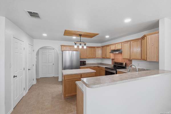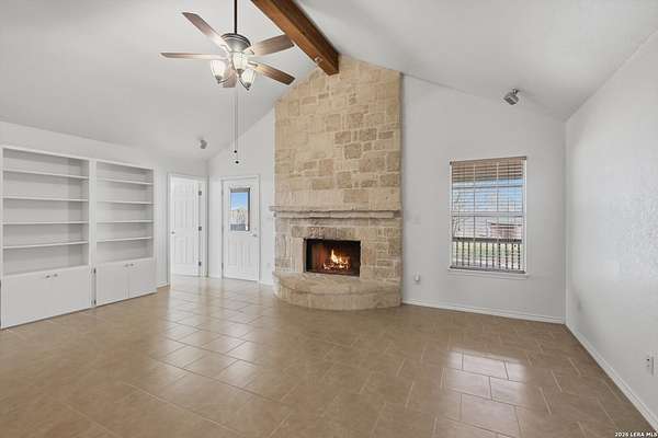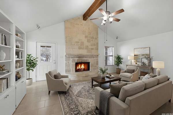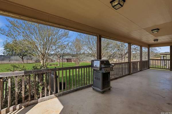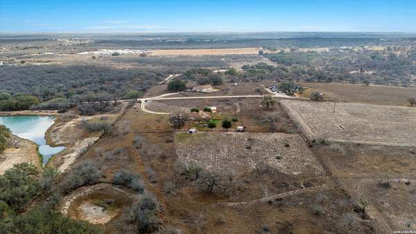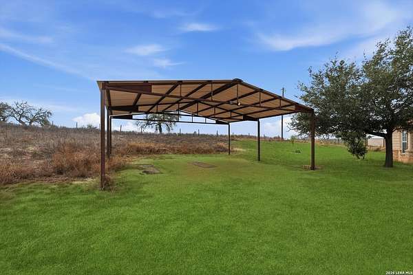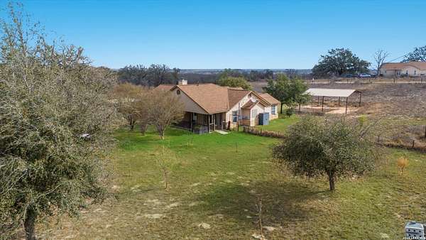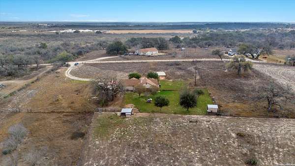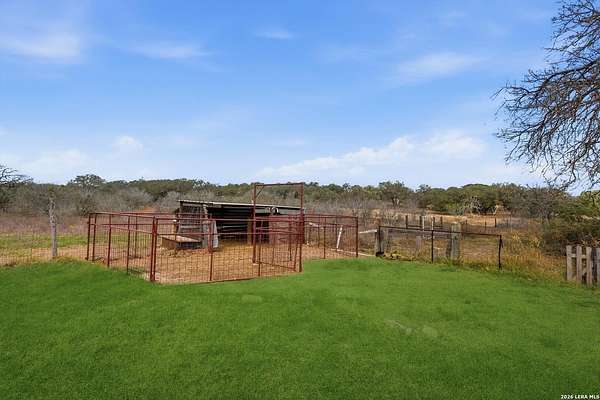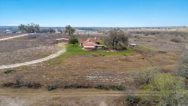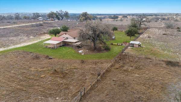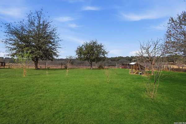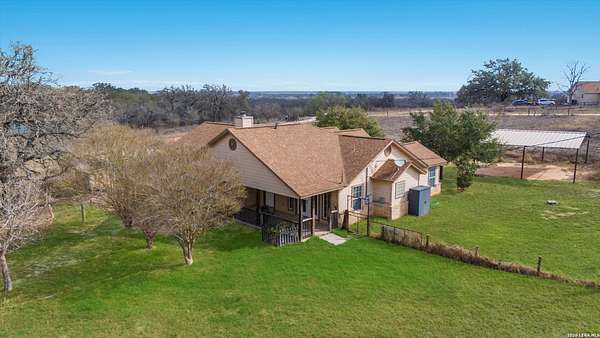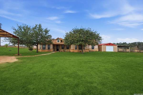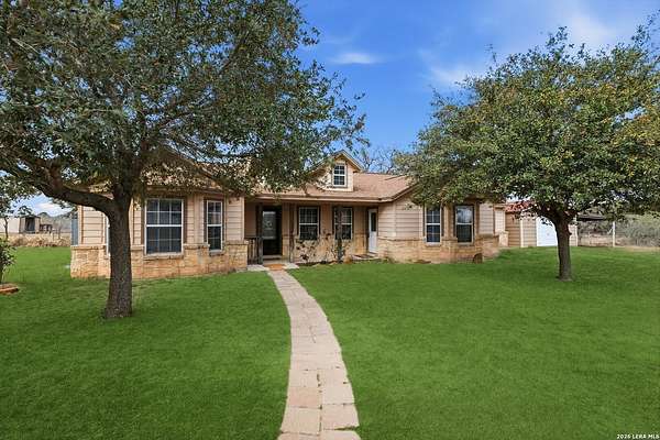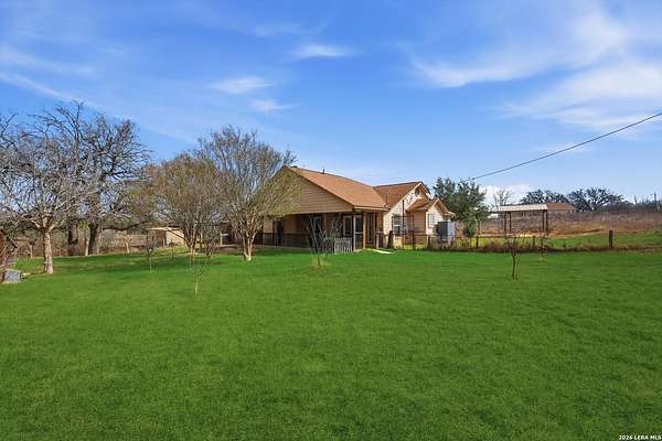Wonderful custom 1-story home on 9.89 ac. perfectly situated only 35 minutes from downtown San Antonio! Very private setting with abundant wildlife - deer, wild turkey and doves. Owners added a water well 8/23. High speed internet available so you can work from home! Gated ranch entry with a custom steel gate added 9/25. Fully fenced w/multiple cross-fenced sections and includes a small stock tank, a goat pen, chicken coop, bunny hutch and many fruit & nut trees (including apple, peach, plum, mulberry, pomegranate, and almond). Owners also added a water softener/RO system 1/24, and an Iron Breaker 3/25. Benson City water is on-site too. A/C coil was replaced 7/25. New dishwasher installed 2/26. Enjoy the island kitchen with breakfast bar and 2 large pantries. Fridge, Washer and Dryer stay! Large formal dining room and an office with French doors leading to the huge 35' X 10' rear patio with beautiful views of the sunset. The Family room has high ceilings and a floor-to-ceiling stone fireplace. Primary bedroom is set far away from the secondary bedrooms. One car garage and 2 separate carports to store your vehicles or equipment. Must see!! Grass is enhanced in the photos.