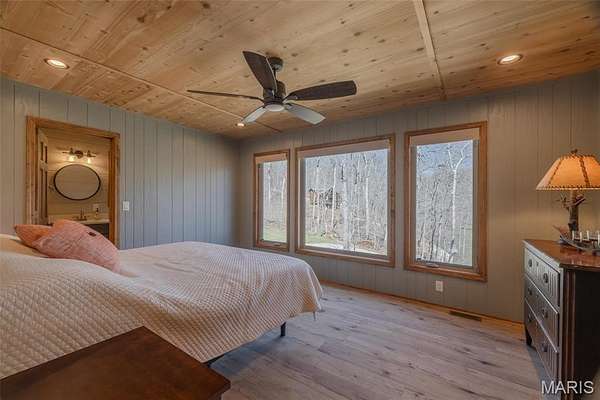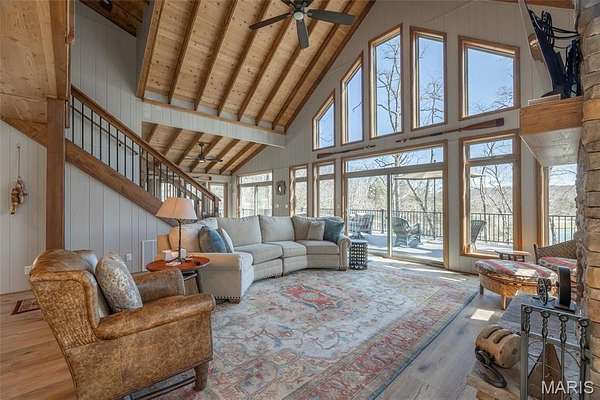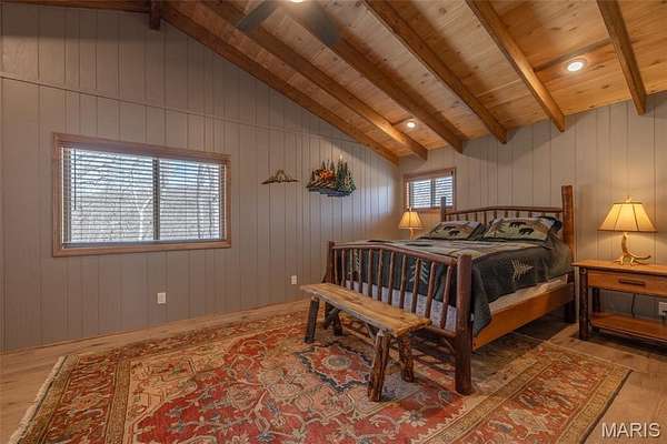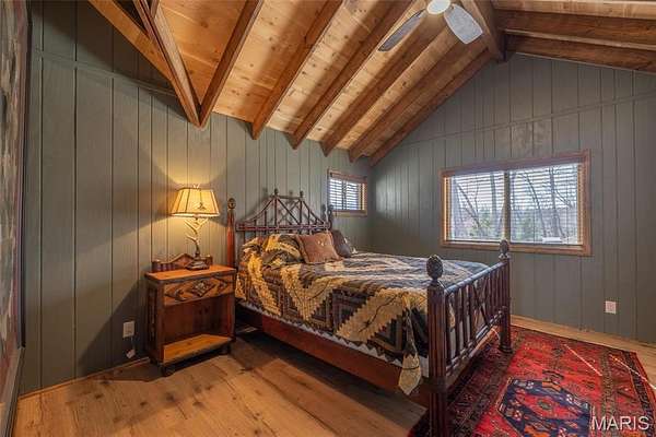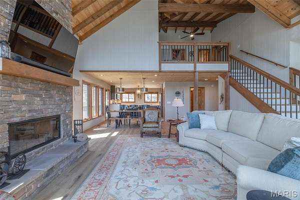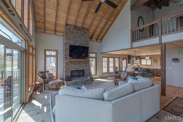 Nestled on the shores of 236-acre Alpine Lake, this stunning 4 BR, 3.5 BA waterfront chalet offers luxury living at its finest. The home boasts an open floorplan with breathtaking oversized windows that bathe the space in natural light, highlighting the elegant stone wall fireplace in the living area. The gourmet kitchen features sleek quartz countertops and a spacious center island with barstool seating, perfect for entertaining. The primary suite, located on the main level, offers an ensuite bathroom and serene lake views. The upstairs loft features three beautifully designed bedrooms, one with a private bath, while the other two share a spacious full bathroom. A wraparound deck with maintenance-free decking provides stunning outdoor views, while a sunken fire pit area overlooks the lake. Enjoy easy access to the water from the stone patio, or explore nearby nature trails. With an oversized garage and all furniture included, this move-in ready retreat offers ultimate lakeside luxury.