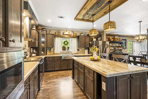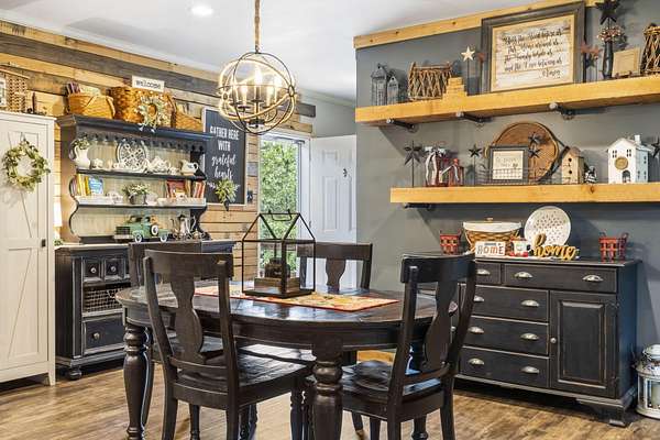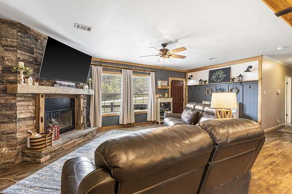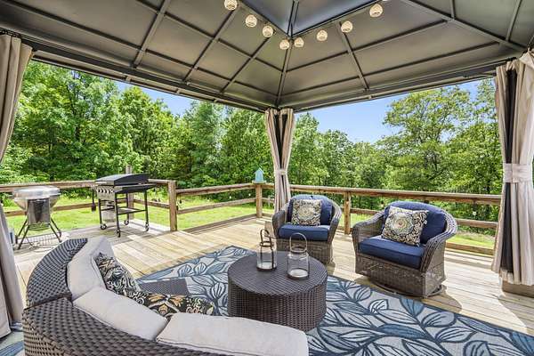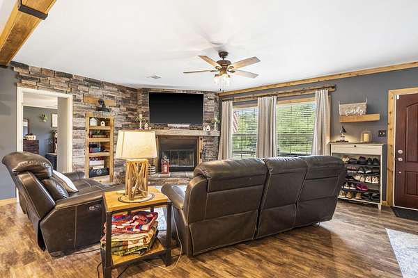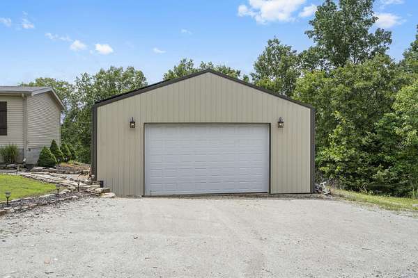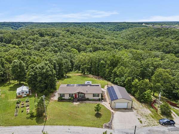 Escape to peace and privacy on 5 +/- serene acres in Reeds Spring, MO. This charming 4-bedroom, 2-bath home welcomes you with a brand-new front entry and thoughtfully updated steps, setting the tone for a warm, inviting retreat. Enjoy the best of outdoor living with an expansive back deck with gazebo and stunning Ozark Mountain views. Host movie nights under the stars with the outdoor screen, relax around the fire pit, or explore the endless possibilities offered by the HUGE shop, complete with a tall garage door and concrete pad. Inside, the open floor plan is filled with custom character. Cozy up by the rock wood-burning fireplace, accented by a 100-year-old mantle that brings rustic charm to the living area. The spacious master suite is your personal haven, featuring a spa-like en-suite with a walk-in shower and oversized soaking tub for ultimate relaxation. This energy-efficient home is powered by solar panels and has a low monthly HOA of just $25 to cover water and road maintenance--combining sustainability with affordability. Tucked away on a quiet dead-end road just 15-20 minutes from Table Rock Lake, this property offers unmatched seclusion without sacrificing convenience.