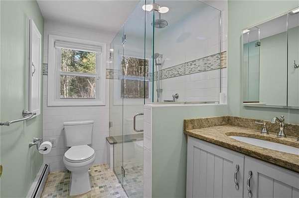 Perched gracefully atop a hill overlooking farmland on 4.4 private acres, this well-built ranch offers the perfect blend of quality craftsmanship, comfort, and natural beauty. Sunlight pours through the home, highlighting original oak hardwood flooring throughout the main level, creating a warm, inviting atmosphere. The thoughtfully renovated bathroom features elegant marble finishes and sleek glass shower doors, adding a touch of modern luxury. Open kitchen design has updated stainless steel appliances, and offers a gracious eating area for entertaining. Designed for peace of mind and everyday ease, the home is equipped with a Generac whole-house generator powered by propane, ensuring uninterrupted comfort year-round. Lower level has a comfortable family room anchored by a wood burning fireplace, great for staying warm during the cold New England winters. A second bath is also offered on the lower level as an added amenity. An integral garage provides convenience and additional storage, while the expansive setting offers privacy, open space, and room to enjoy the outdoors. Well maintained and move-in ready, this exceptional property is ready for immediate occupancy-an ideal retreat with timeless appeal.