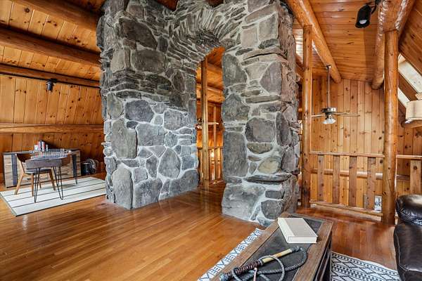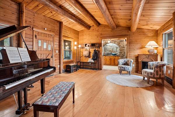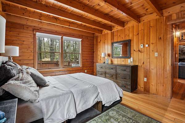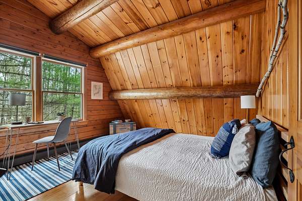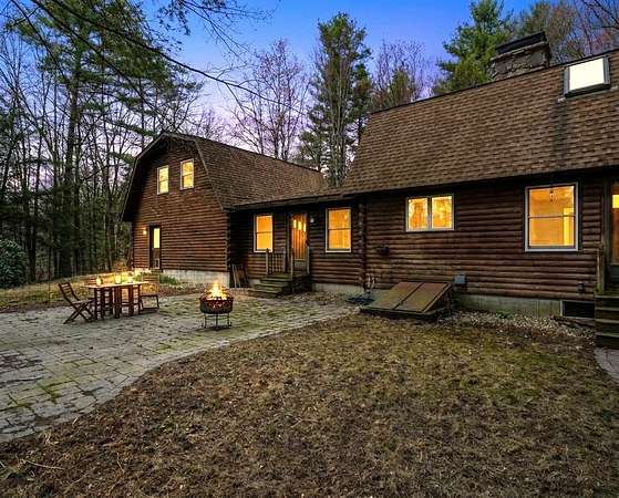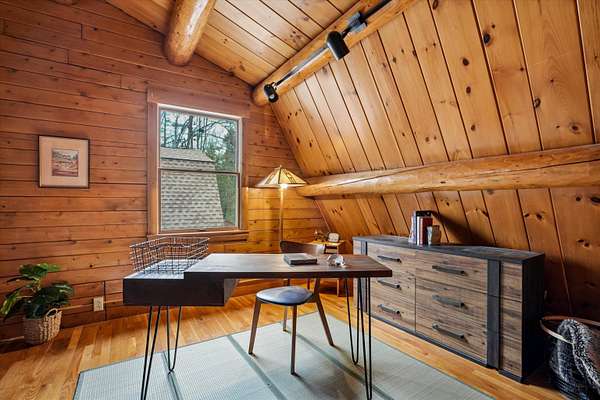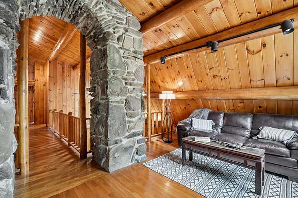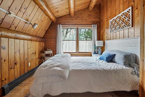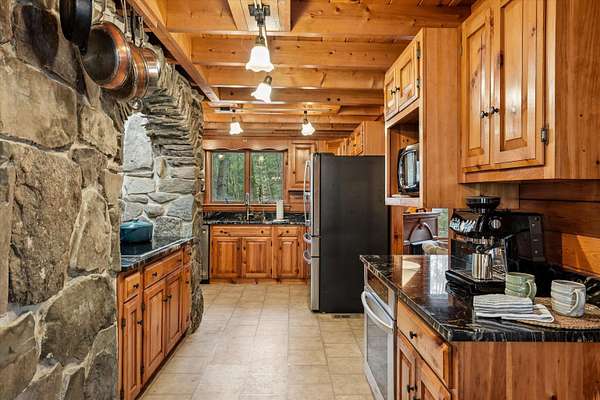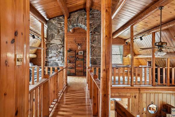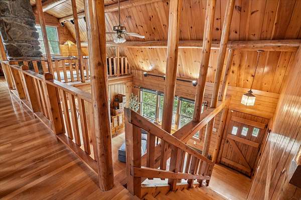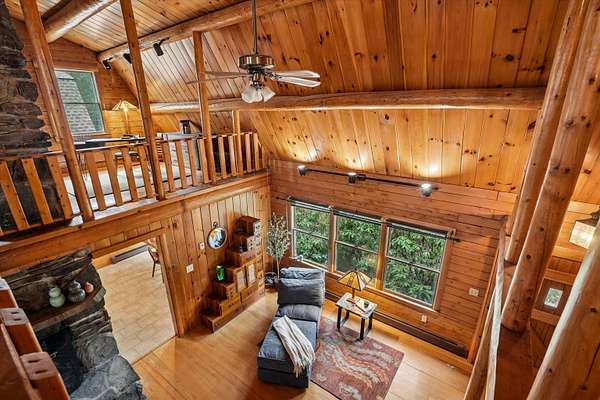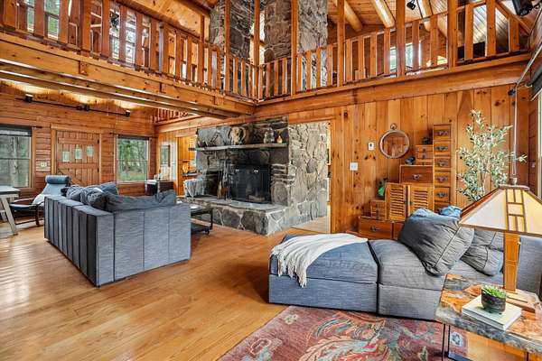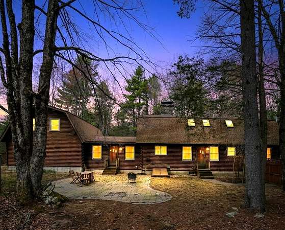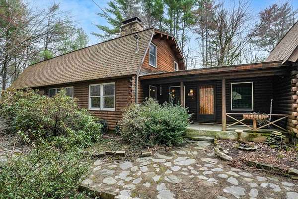 A DISTINCTIVE CEDAR LOG RETREAT WHERE CRAFTSMANSHIP AND CHARACTER TAKE CENTER STAGE! Located on a wooded corner lot, this custom-built residence offers a rare alternative to the ordinary. Rich in texture, warmth and architectural detail yet within easy reach of nearby conveniences enjoy the best of small-town country living. A welcoming rock wall introduces the property and a stone path invites you to choose your approach. Directly enter from the garage or arrive through the covered patio where quiet surroundings beckon you to relax and take in the setting. The main entrance opens to a breathtaking two-story great room where soaring volume, natural light and a dramatic stone fireplace create an unforgettable first impression. A signature catwalk defines the upper level, while exposed beams and handcrafted details reflect enduring construction and thoughtful design. The expansive hearth offers a natural gathering place perfect for evenings and conversation by the fire. The experience continues in the kitchen where an induction cooktop is artfully set under a stone arch and gleaming granite delivers function and visual impact. Dine surrounded by natural views before transitioning to the family room, a softer retreat wrapped in warm wood tones and accentuated by beamwork overhead. In warm months the stone patio will play host to alfresco fun and an enclosed hot tub provides a secluded escape for unwinding under the stars. Inside, ascend the staircase and cross beneath a masonry archway to a unique lofted space to read, relax or work. After a day spent exploring trails or winter slopes return to the first floor primary with dual closets while additional first floor room offers space for an office, den or rest. Upstairs two generous bedrooms with soaring ceilings feature treetop views while a skylit bath enhances the sense of sanctuary. Bonus space over the garage awaits your vision for future expansion. Sleep tight and recharge while your EV does the same in its garage!