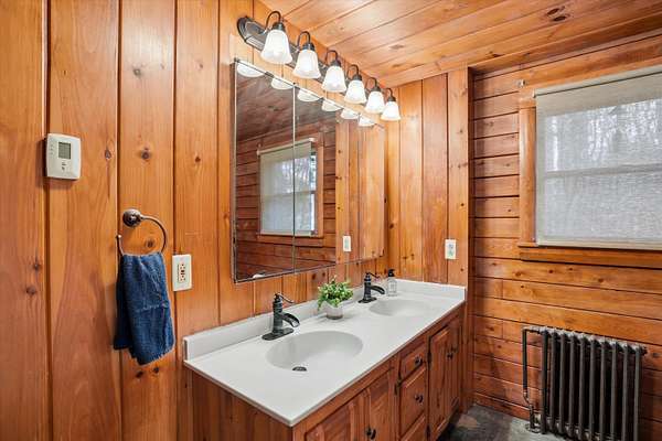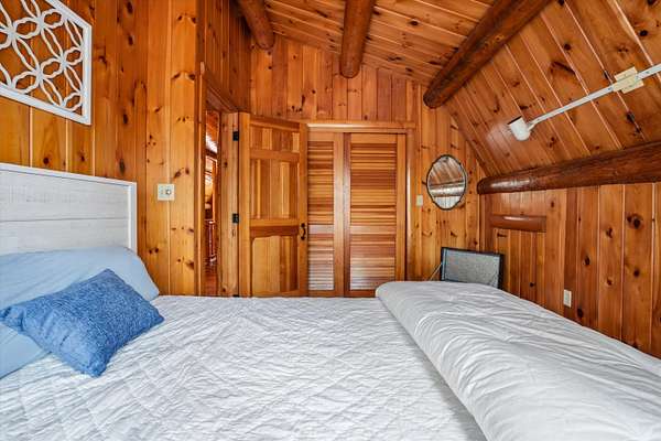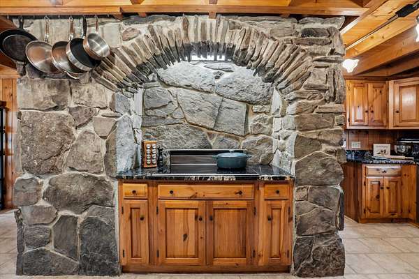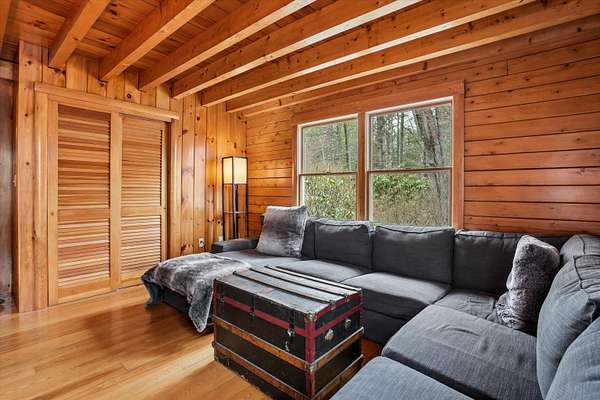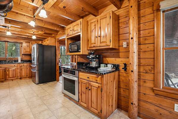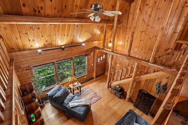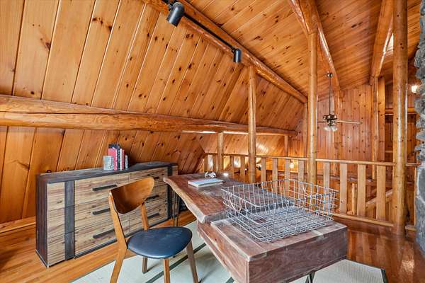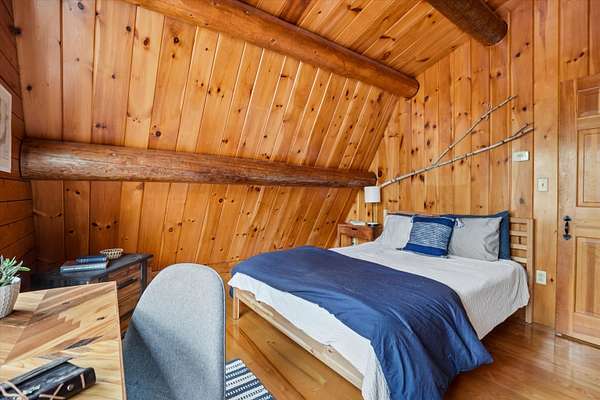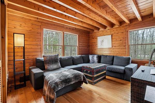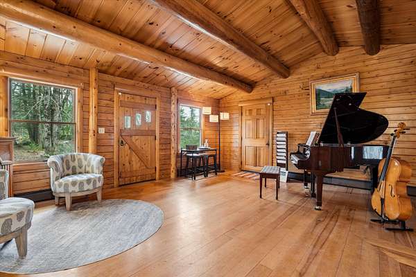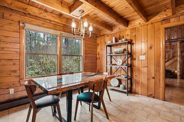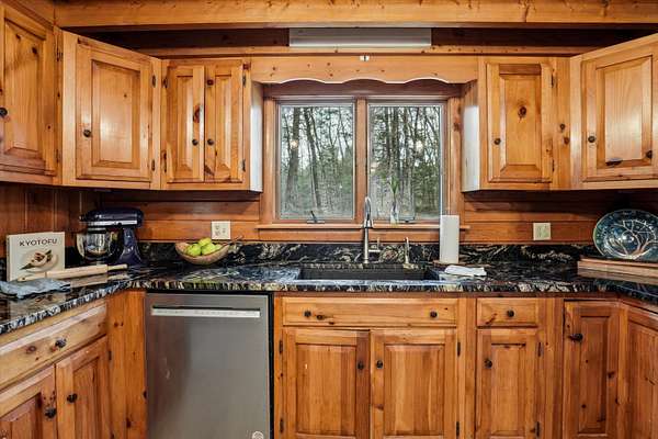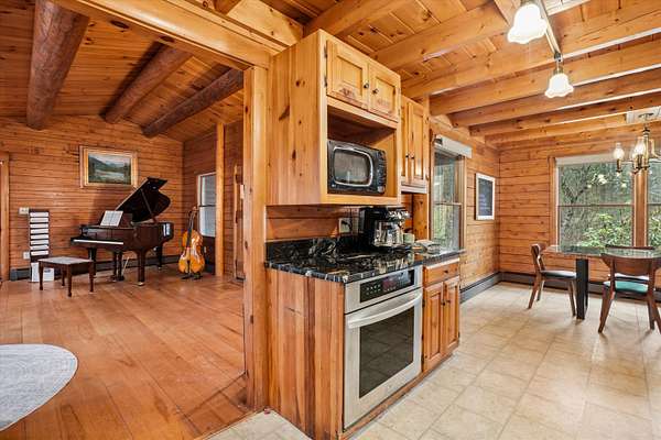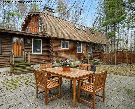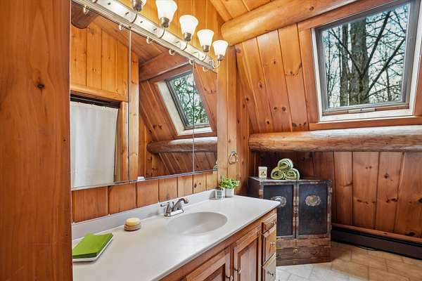 A DISTINCTIVE CEDAR LOG RETREAT WHERE CRAFTSMANSHIP AND CHARACTER TAKE CENTER STAGE! Located on a wooded corner lot, this custom-built residence offers a rare alternative to the ordinary. Rich in texture, warmth and architectural detail yet within easy reach of nearby conveniences enjoy the best of small-town country living. A welcoming rock wall introduces the property and a stone path invites you to choose your approach. Directly enter from the garage or arrive through the covered patio where quiet surroundings beckon you to relax and take in the setting. The main entrance opens to a breathtaking two-story great room where soaring volume, natural light and a dramatic stone fireplace create an unforgettable first impression. A signature catwalk defines the upper level, while exposed beams and handcrafted details reflect enduring construction and thoughtful design. The expansive hearth offers a natural gathering place perfect for evenings and conversation by the fire. The experience continues in the kitchen where an induction cooktop is artfully set under a stone arch and gleaming granite delivers function and visual impact. Dine surrounded by natural views before transitioning to the family room, a softer retreat wrapped in warm wood tones and accentuated by beamwork overhead. In warm months the stone patio will play host to alfresco fun and an enclosed hot tub provides a secluded escape for unwinding under the stars. Inside, ascend the staircase and cross beneath a masonry archway to a unique lofted space to read, relax or work. After a day spent exploring trails or winter slopes return to the first floor primary with dual closets while additional first floor room offers space for an office, den or rest. Upstairs two generous bedrooms with soaring ceilings feature treetop views while a skylit bath enhances the sense of sanctuary. Bonus space over the garage awaits your vision for future expansion. Sleep tight and recharge while your EV does the same in its garage!
