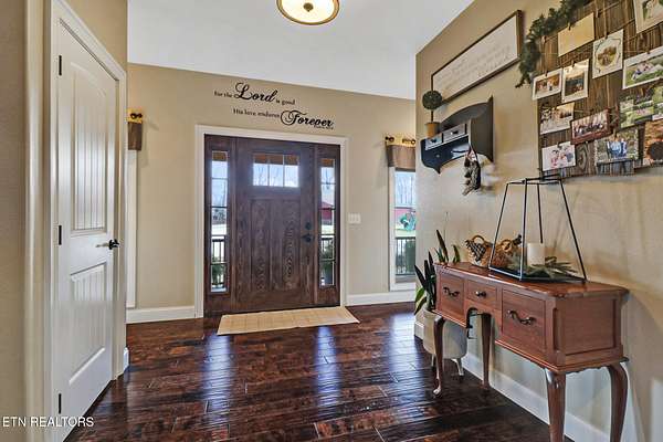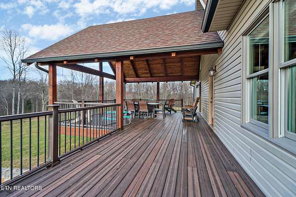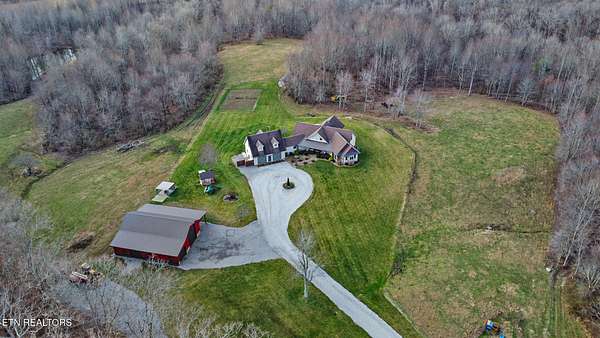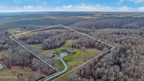 A RARE OPPORTUNITY to own a beautifully crafted custom home on nearly 44 acres of pristine, private countryside. This impressive custom-built, two-story home has 5,600 +/- sq ft of heated and cooled area. Featuring 4 bedrooms and 3.5 baths on 43.81 private acres at the end of a long, secluded drive. The living area features a stunning floor-to-ceiling stone fireplace reaching up to a beautiful wood cathedral ceiling, while the dining room showcases an elegant, coffered ceiling. The well-designed kitchen has custom cabinets, granite tops, stainless appliances, pantry and nice island. The main level primary suite offers a walk-in tile shower, jetted tub, large closet, and an adjoining nursery, craft, or office space. Upstairs, a landing overlooks the living area and provides a versatile bonus space. Bedrooms two and three share a full bath. Just off the kitchen is an oversized utility/mud room with built-in cabinetry, providing access to the garage, outdoors, or a private upstairs living area above the garage. This space includes a fourth bedroom, full bath, bonus room, and kitchenette, ideal for guests or extended family. There is a covered front porch and a covered back deck with Trex decking and a vaulted wood ceiling, perfect for outdoor living. The walkout basement is partially finished and offers endless potential, opening to a patio with a hot tub and additional outdoor living space. The attached 28x32 garage is heated and cooled and offers ample room for vehicles, storage and has washer and dryer hook up. The property is mostly fenced and includes a pond, flowing creek, open pasture, beautiful woods, and multiple food plots, perfect for a working cattle farm, recreational use, or peaceful country living. A 48x50 RV garage/shop provides excellent space for equipment, recreational vehicles, or hobbies. Well maintained and offering exceptional privacy, this property is a rare opportunity to enjoy serene rural living.
