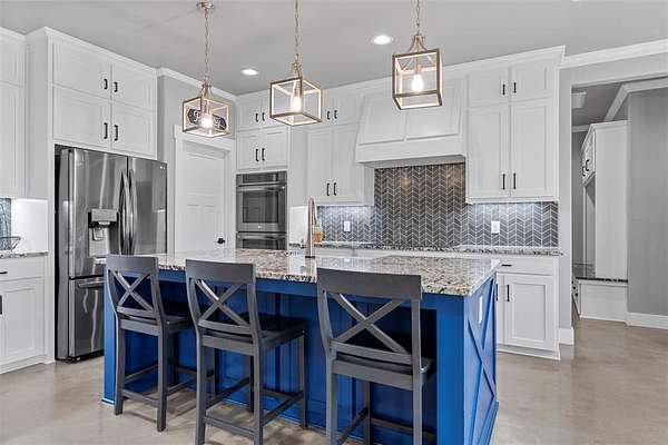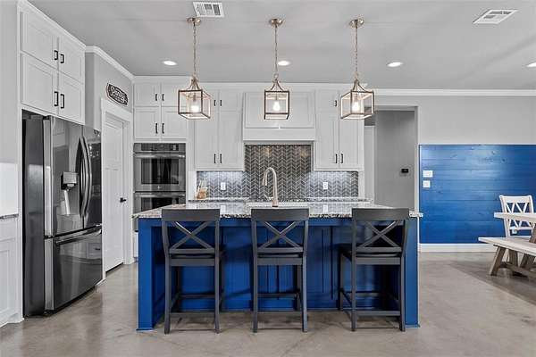 Inside, the home impresses with concrete floors, a warm stone fireplace with built-ins, and a stunning open-concept kitchen featuring double ovens, an oversized island, gigantic walk-in pantry, and a coffee bar that's as functional as it is charming.