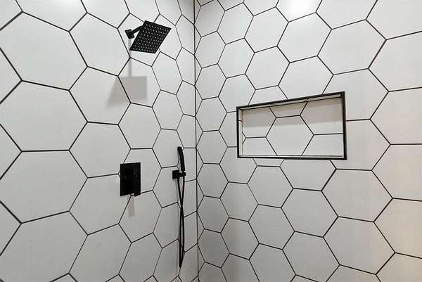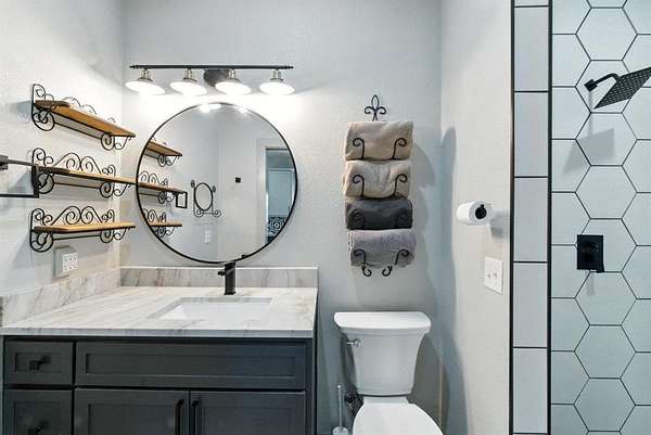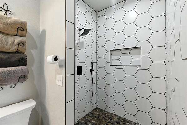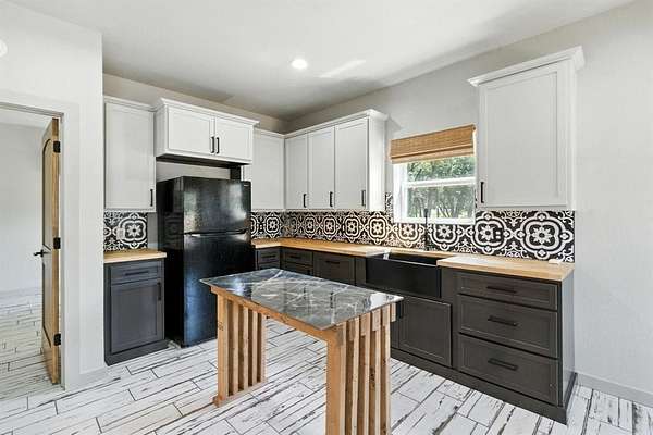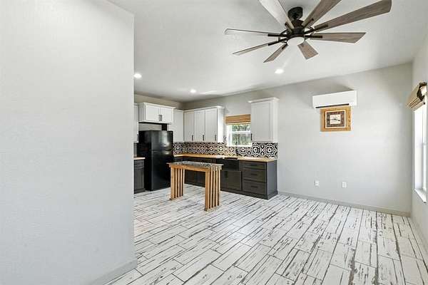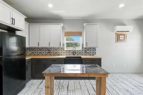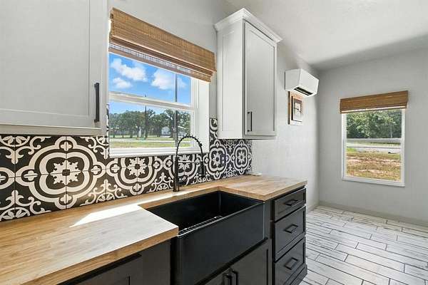 Step inside to find a thoughtfully designed living space, featuring a kitchen with butcher block countertops, decorative tile backsplash, and open shelving for a stylish yet cozy feel. The bedroom is generously sized with its own mini-split AC, a walk-in closet, and easy access to a spacious bathroom with a large walk-in shower. A utility closet with stackable washer and dryer keeps things convenient and efficient.