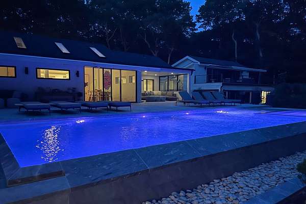 This contemporary Hamptons escape on 2 acres in the heart of East Hampton captures the essence of chic luxury living. Peace and privacy surround the single-level contemporary home with 6,388 +/- SF, 6 bedrooms, 7 full baths, 3 half baths, 2 fireplaces, attached 4-car garage, heated infinity gunite pool and spa. The pool deck is entirely custom tiled and the spa itself, is incredible, with enough room for 10 people. Interiors are bright and welcoming, featuring white oak hardwood floors and floor-to-ceiling windows that frame a central courtyard, anchored by a tranquil water feature fountain. Multiple sliding glass doors open to a wraparound patio running the length of the home, greatly expanding the living space during the Hamptons summer. Ready for year-round living with 3 full offices in the home, including the 500+/- SF main office and attached 400+/- SF deck. Skylights illuminate the eat-in kitchen and breakfast nook, while the dining room is bathed in natural light and overlooks the grounds. The main living room is open and exceptionally comfortable, with a wall of floor-to-ceiling glass sliders and a wood-burning fireplace at its heart. An additional open-concept gathering space opens to the pool and 1,000+/- SF porcelain tile patio. Each of the bedrooms is bright and accommodating for loved ones and guests, including a large ensuite primary with an exceptionally luxe marble bath. A separate pool house with a covered patio sets the stage for effortless al fresco dining. On the finished lower level, two ensuite bedrooms are joined by a large living room with a wall of sliding glass doors and walkout access, plus an eat-in bar and wet bar that make entertaining easy. A spacious home gym completes this level, creating a resort-like experience at home. This central East Hampton location is close to the best of life in the Hamptons - beautiful ocean and bay beaches, farmstands, marinas, and elevated life in the nearby Villages of Sag Harbor and East Hampton.