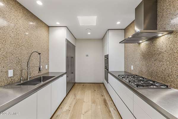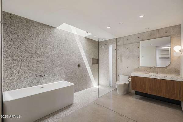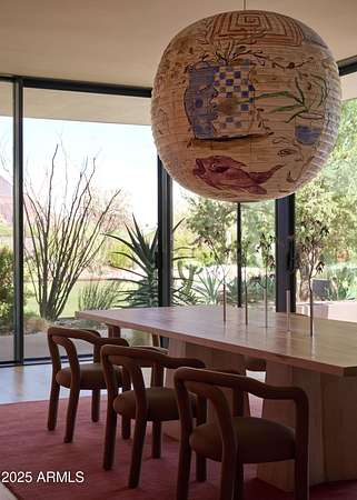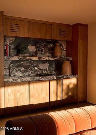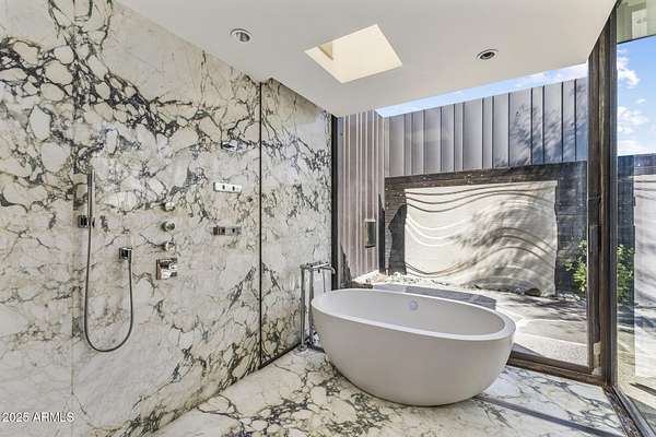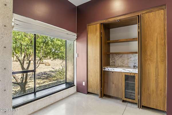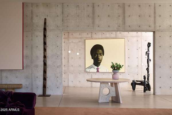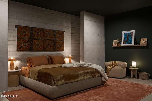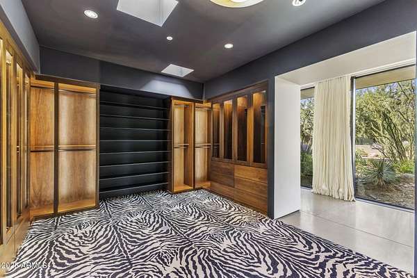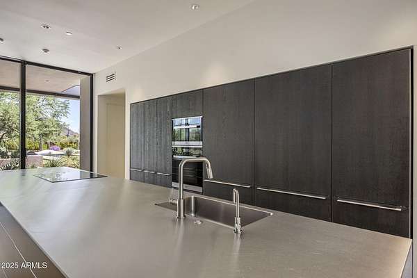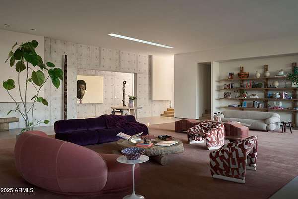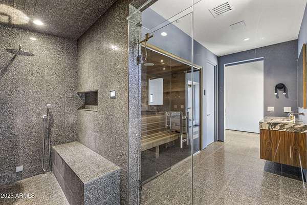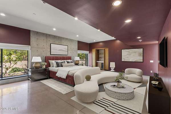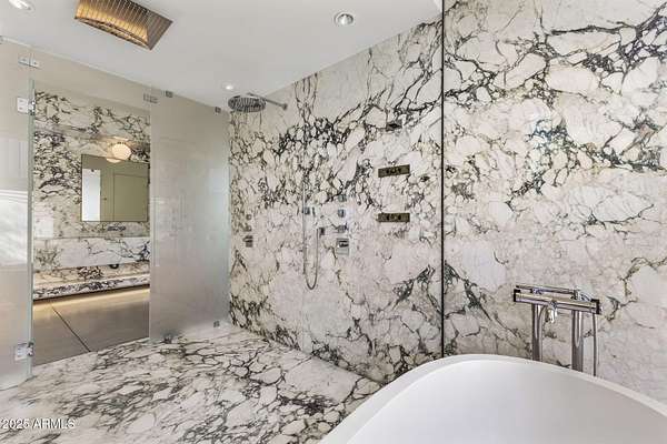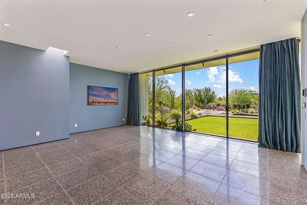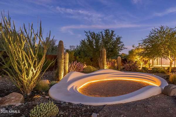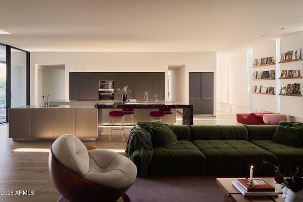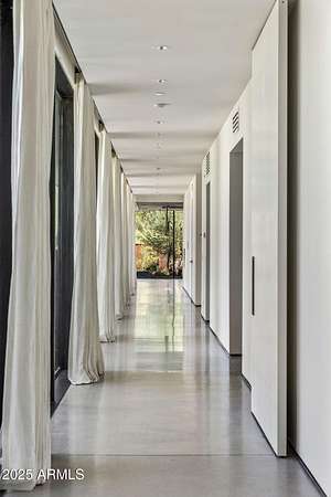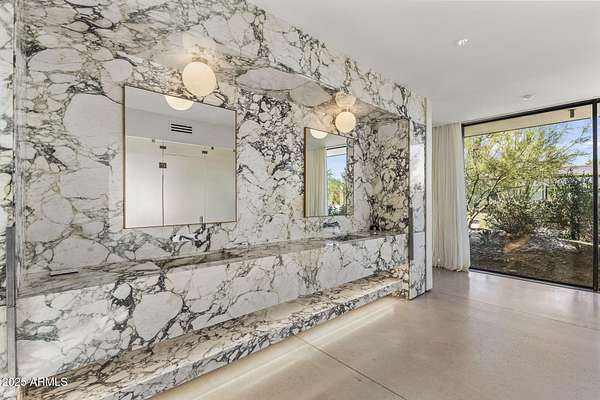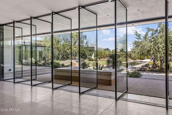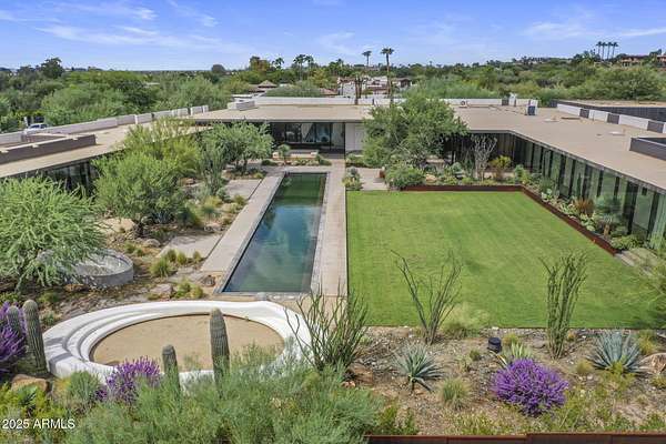 One-of-a-kind Modern Desert Contemporary Estate set on a private 1.72-acre corner lot with unobstructed views of Camelback Mountain, the Praying Monk, and Piestewa Peak. This private architectural masterpiece spans 10,865 sqft and was crafted with the highest level of design and materials. Built in an angled ''U'' shape, the residence showcases poured-in-place concrete, custom pivot doors, and expansive floor-to-ceiling glass walls that capture dramatic desert light while framing the mountain views and vibrant landscaping. Two mirrored corridors balance the design: one dedicated to the primary suite with an additional ensuite study/guest bedroom, the other to a theater, two ensuite bedrooms, and a versatile gym/flex space complete with steam shower and sauna. At the heart of the home, a voluminous living room with a double-sided fireplace opens to an adjacent lounge and bar, creating an ideal setting for both entertaining and displaying art that is enhanced by custom gallery-style lighting throughout. The expansive Bulthaup kitchen features a double island layout, Miele and Thermador appliances, generous storage, and a seamless connection to the family room with a custom media wall and breakfast area. A separate prep kitchen and butler's pantry complete the culinary experience. The formal dining room opens to the backyard with stunning views, blending indoor and outdoor living. The primary suite is a private retreat, distinguished by custom walnut cabinetry, a hidden wet bar, and two oversized walk-in closets. The luxurious bath features a Calacatta marble dual vanity with integrated storage, dual water closets, an oversized shower with dual showerheads, and a freestanding soaking tub overlooking a serene private courtyard that floods the space with natural light. The outdoor spaces are designed for both relaxation and entertaining, offering multiple gathering areas, a bbq area, seating lounge, grassy play pad, and a lap pool. Car enthusiasts will appreciate the 2,000-sq-ft double-height garage with three oversized bays,space for abundant cabinetry/storage, and direct access to the main residence. For larger collections, additional bays may be added on the adjacent land. A residence of this caliber must be experienced in person to truly appreciate its architecture, lifestyle, and one-of-a-kind presence in Paradise Valley.