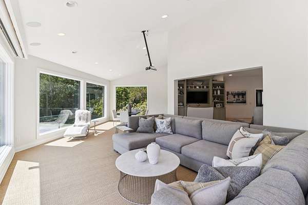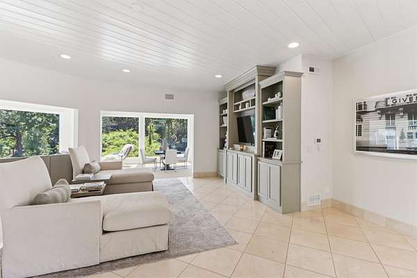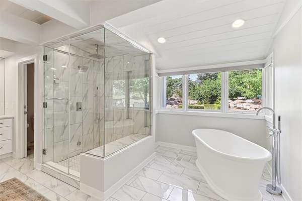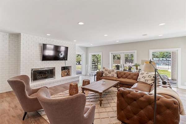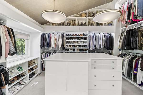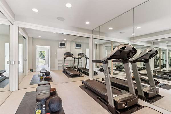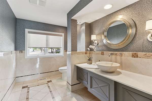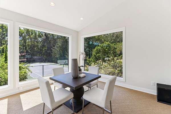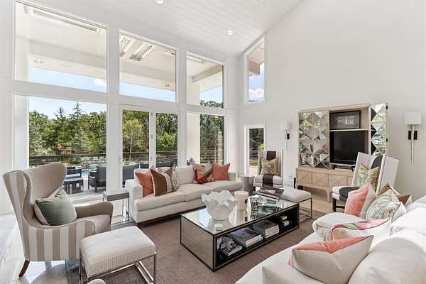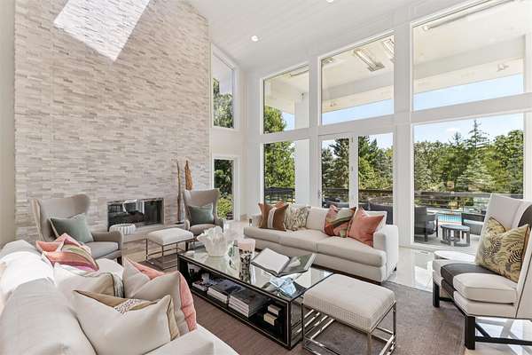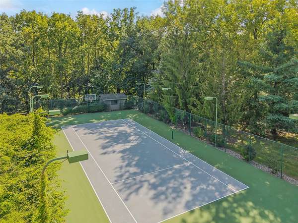 Set on a private 3.4 acre wooded site is this 9,000 sq. ft. spectacular contemporary estate home with first floor master bedroom, 4 total bedrooms, 6 bath home with 22' x 40' in-ground saltwater pool with waterfall and 60' x 120' tennis court and view of pond. There are garages for at least 7 cars, including a 35' x 60' detached garage with guest quarters or mother-in-law apartment and basement for storage. The home was extensively renovated at a cost of over $1M. The master suite's bath has granite, heated floors & towel racks & all new fixtures. All other BRs are suites with private baths. LL has office, rec room, wine cellar & custom bar area. The 4-zone heating and air conditioning is natural gas forced air and geothermal. This is a true estate property at a convenient location.