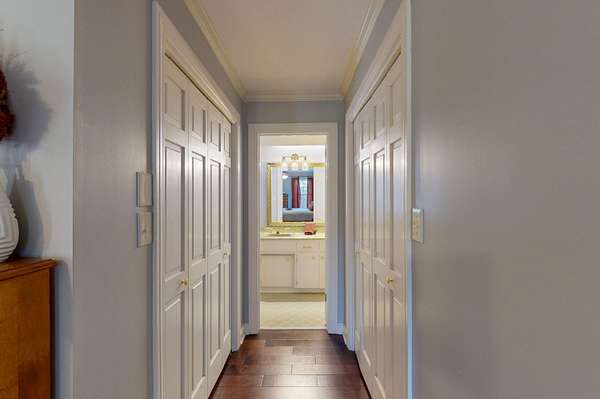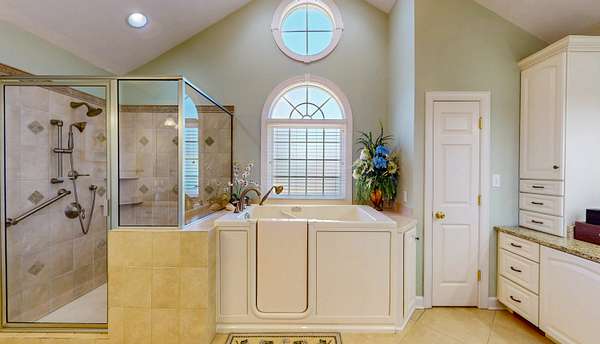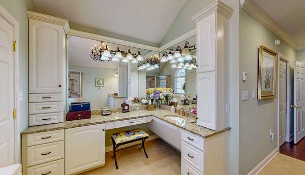 - Bathroom Mirror(s), Bookcases, Built-In Features, Cathedral Ceiling(s), Ceiling Fan(s), Crown Molding, Double Closets, Double Vanity, Eat-In Kitchen, Granite Counters, High Speed Internet, Kitchen Island, Laminate Counters, Pantry, Primary Downstairs, Separate Living Quarters, Soaking Tub, Split Bedrooms, Walk-In Closet(s), Walk-In Shower