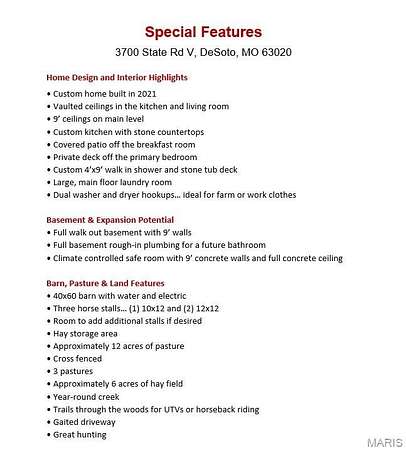 Set on 55+/- acres, this custom built 2700 sq ft home is just 5 years old and designed for country living with all the modern comforts. Wheteher you have horses, cattle, or love to hunt... this property is waiting just for you! Inside: The open floor plan features vaulted ceilings, a chef's kitchen, and a luxury master suite with private deck access--ideal for enjoying peaceful mornings. You'll find 4 bedrooms, 3 full baths, and a freshly painted interior. The mudroom and laundry are built for farm life, with two washer/dryer hookups to handle all the horse blankets, barn gear, and everyday loads. A walkout basement offers plenty of room for storage or future finish. Outside: The property includes roughly 12 acres fenced and cross-fenced--great for horses or other livestock--plus a hay field and scenic riding trails through the woods. The 40x60 barn has three stalls and space for equipment or tack. A clear creek winds through the acreage, adding both beauty and natural charm. Enjoy evenings on the covered patio surrounded by open views, with easy access to Hwy 67 for quick trips to town. A rare find that balances country serenity with everyday convenience.