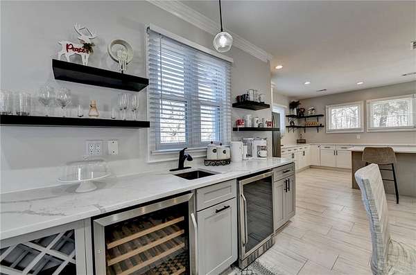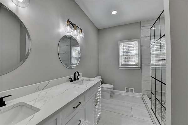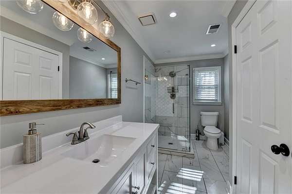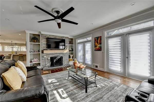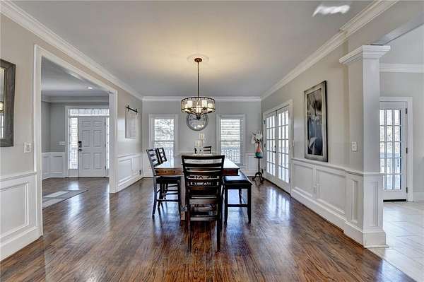 Stunning, fully renovated and well maintained Cape Cod-style home, featuring 4 bedrooms and 4.5 bathrooms and located in the highly sought-after Lochwolde subdivision! Tucked away in a cul-de-sac and situated on one of the largest lots in the community, this incredible property spans nearly 5 acres and backs up to a private lake for unmatched privacy and scenic views. The beautifully updated chef's kitchen features quartz countertops, stainless steel appliances, and an oversized island-perfect for gathering and entertaining. Enjoy the expansive wraparound porch, or host guests on the spacious back deck. The impressive primary suite boasts a private fireplace and a large walk-in closet. The luxurious en-suite bath showcases a tiled shower with seamless glass doors, a modern soaking tub, and dual vanities. The finished basement includes a full bathroom and media room, ideal to convert into an in-law suite-just add kitchen appliances to complete the space. A detached garage with its own driveway entrance offers added convenience, along with two separate driveways for ample parking. Relax by the firepit, fish in the private lake, and take advantage of the bar and brand-new HVAC system in the detached garage. With exceptional privacy and endless entertaining possibilities, this home truly has it all!