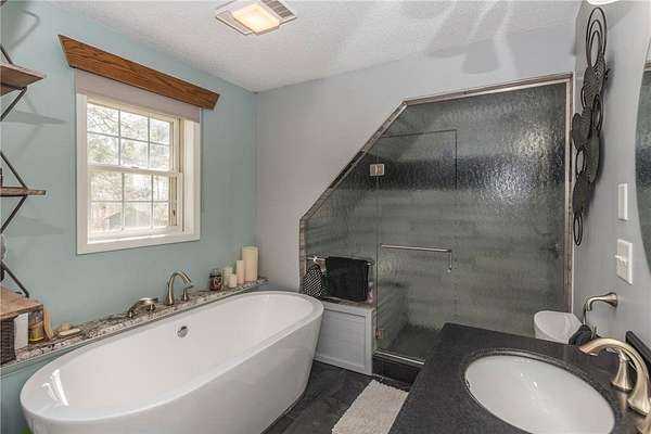 Step inside to find a spacious, updated interior featuring stainless steel appliances, granite countertops, and two cozy wood-burning fireplaces. The primary suite boasts a private deck with river views, a generous walk-in closet, a soaking tub, steam room, and a large tiled shower -- your personal spa oasis.