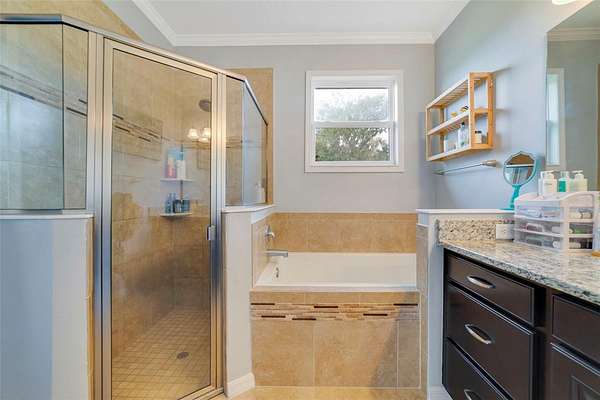 - Ceiling Fans(s), Chair Rail, Crown Molding, Eat-In Kitchen, Open Floorplan, Primary Bedroom Main Floor, Solid Surface Counters, Solid Wood Cabinets, Split Bedroom, Stone Counters, Thermostat, Walk-In Closet(s), Window Treatments