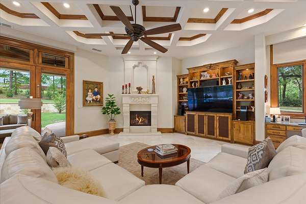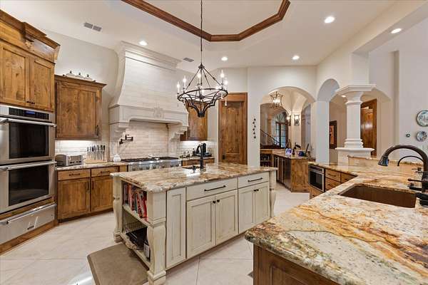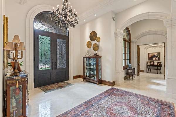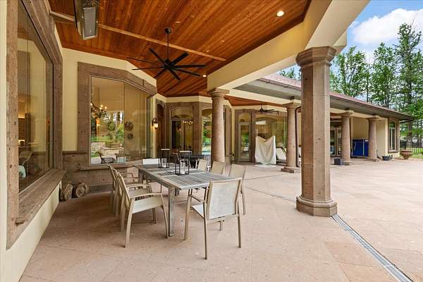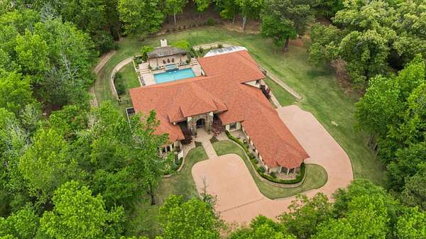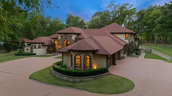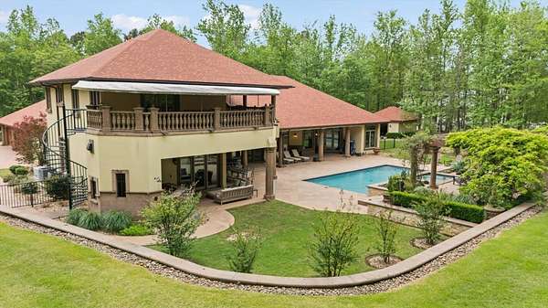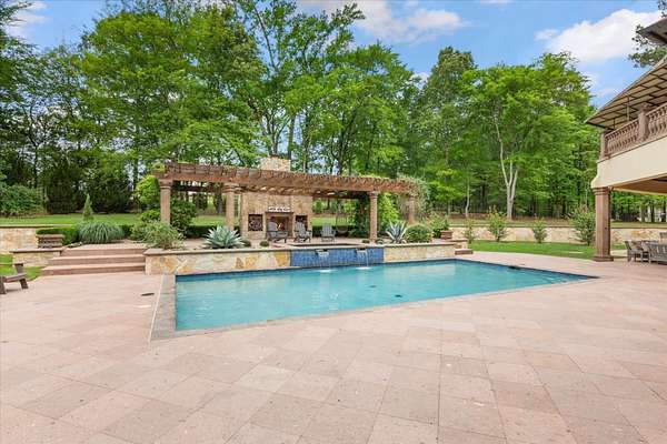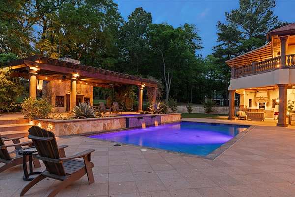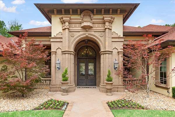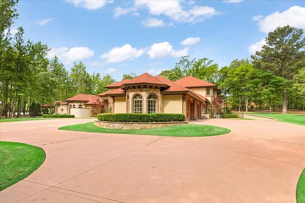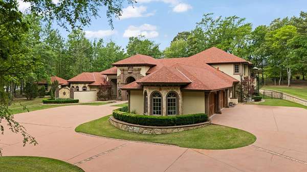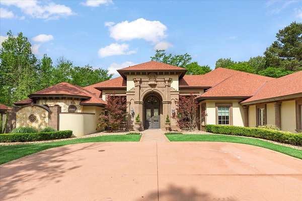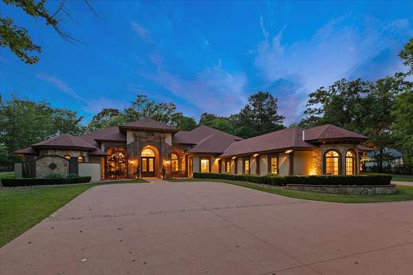 Welcome to Casa Cantera, this estate offers an extraordinary luxury retreat nestled on 3 pristine acres in North Longview’s prestigious Champions Ridge Estates. This Mediterranean masterpiece is a rare blend of timeless architecture, privacy, and natural beauty. The home showcases impeccable craftsmanship and refined architectural details throughout. The serene primary suite is a true sanctuary, located on the main level, offering dual baths and separate his-and-hers closets—a true retreat bathed in natural light with tranquil views of the resort-style backyard. With a private office/study including built-ins and multiple refined living spaces, the home features 5 bedrooms and 4.5 bathrooms, where timeless craftsmanship meets modern innovation. From the moment you arrive through the private gated entrance, framed by rod iron fencing and lush, meticulously curated landscaping, you’re greeted by architectural excellence and attention to detail. The grand 10-foot iron double entry doors with a striking 5-foot transom open to expansive interiors highlighted by polished marble floors, 2” x 6” construction, and a foundation engineered for longevity with reinforced fiberglass mesh and over 50 piers. Throughout the home, electric shades provide both convenience and refined ambiance. Designed for both comfort and entertainment, the home features a stunning great room with fireplace, a dedicated office with custom built-ins, and a wet bar conveniently located near the wine cellar—complete with its own HVAC system and closed-cell insulation. The chef’s kitchen is outfitted with top-of-the-line Thermador appliances, while the whole-home water filtration system, central vacuum, and open-cell spray foam insulation ensure efficiency and ease of quality living. Outdoor living is unparalleled, featuring a sparkling pool, massive pergola with a fireplace, and multiple entertaining spaces that seamlessly connect with the surrounding landscape. The full luxury outdoor kitchen, along with two ceiling-mounted 60-inch gas patio heaters, creates the perfect setting for year-round enjoyment. Copper gutters add both durability and a distinctive architectural accent to the home’s exterior. The breathtaking topography, lush mature trees, and serene setting create a truly retreat-like atmosphere. Additional standout features include a whole-home 22 KW natural gas backup generator, three tankless gas water heaters, heated floors in all downstairs full baths, a 4-car garage with a new epoxy finish, and a separate 400 SF climate-controlled storage building (not included in square footage). The property also boasts a unique design element with imported hand-carved Cantera and limestone accents sourced from Mexico, adding character and elegance throughout. With a new Class III roof installed in 2026, cedar soffits and trim, a home camera system, and even a dedicated HVAC-equipped dog room, every detail of this home has been thoughtfully designed. Casa Cantera is more than a home; it’s a statement of luxury, privacy, and exceptional living.
