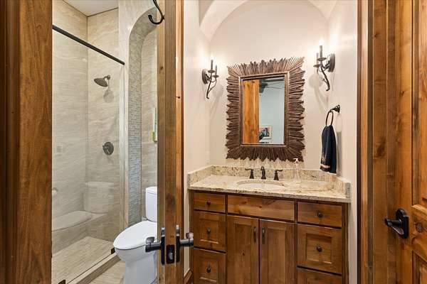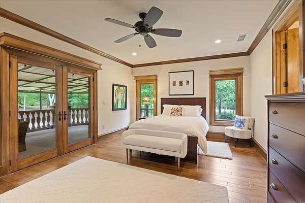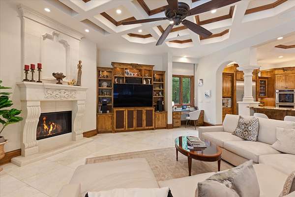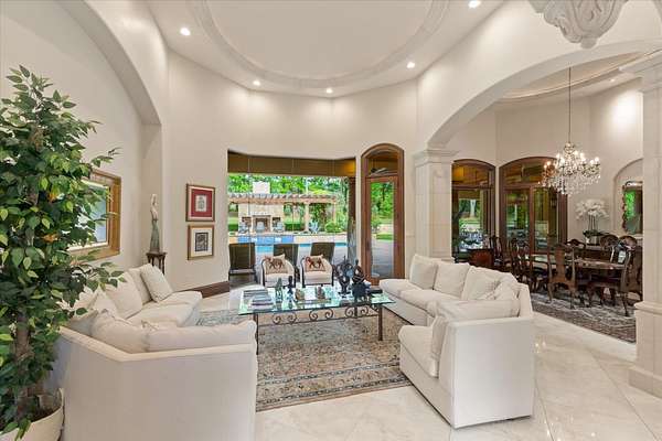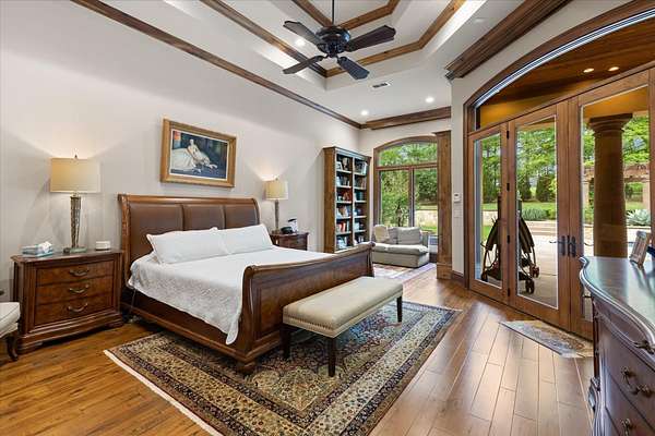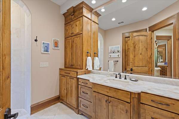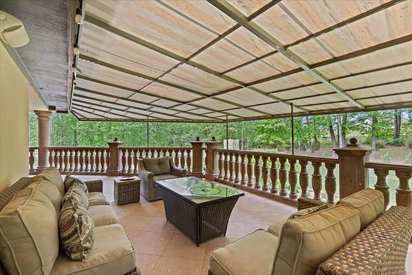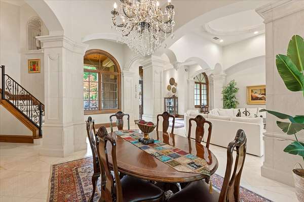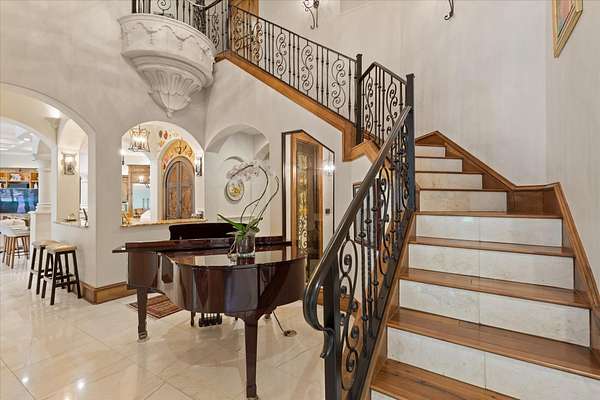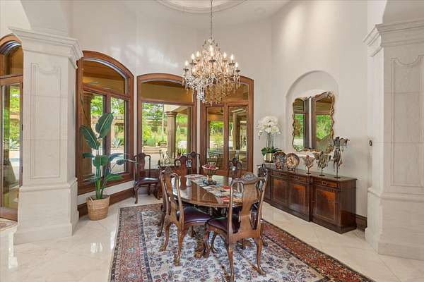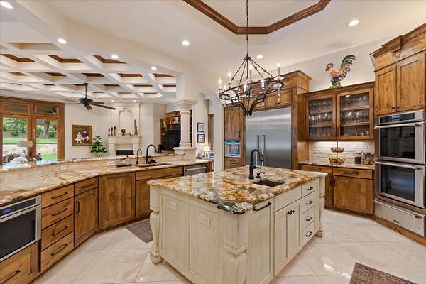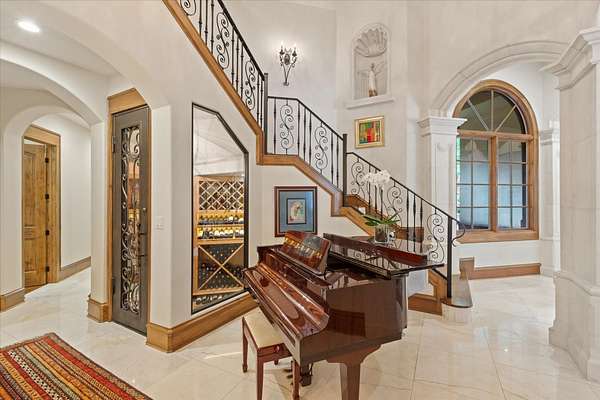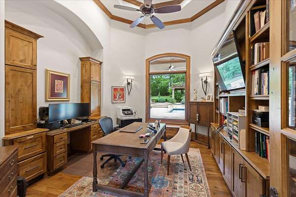 Welcome to Casa Cantera, this estate offers an extraordinary luxury retreat nestled on 3 pristine acres in North Longview’s prestigious Champions Ridge Estates. This Mediterranean masterpiece is a rare blend of timeless architecture, privacy, and natural beauty. The home showcases impeccable craftsmanship and refined architectural details throughout. The serene primary suite is a true sanctuary, located on the main level, offering dual baths and separate his-and-hers closets—a true retreat bathed in natural light with tranquil views of the resort-style backyard. With a private office/study including built-ins and multiple refined living spaces, the home features 5 bedrooms and 4.5 bathrooms, where timeless craftsmanship meets modern innovation. From the moment you arrive through the private gated entrance, framed by rod iron fencing and lush, meticulously curated landscaping, you’re greeted by architectural excellence and attention to detail. The grand 10-foot iron double entry doors with a striking 5-foot transom open to expansive interiors highlighted by polished marble floors, 2” x 6” construction, and a foundation engineered for longevity with reinforced fiberglass mesh and over 50 piers. Throughout the home, electric shades provide both convenience and refined ambiance. Designed for both comfort and entertainment, the home features a stunning great room with fireplace, a dedicated office with custom built-ins, and a wet bar conveniently located near the wine cellar—complete with its own HVAC system and closed-cell insulation. The chef’s kitchen is outfitted with top-of-the-line Thermador appliances, while the whole-home water filtration system, central vacuum, and open-cell spray foam insulation ensure efficiency and ease of quality living. Outdoor living is unparalleled, featuring a sparkling pool, massive pergola with a fireplace, and multiple entertaining spaces that seamlessly connect with the surrounding landscape. The full luxury outdoor kitchen, along with two ceiling-mounted 60-inch gas patio heaters, creates the perfect setting for year-round enjoyment. Copper gutters add both durability and a distinctive architectural accent to the home’s exterior. The breathtaking topography, lush mature trees, and serene setting create a truly retreat-like atmosphere. Additional standout features include a whole-home 22 KW natural gas backup generator, three tankless gas water heaters, heated floors in all downstairs full baths, a 4-car garage with a new epoxy finish, and a separate 400 SF climate-controlled storage building (not included in square footage). The property also boasts a unique design element with imported hand-carved Cantera and limestone accents sourced from Mexico, adding character and elegance throughout. With a new Class III roof installed in 2026, cedar soffits and trim, a home camera system, and even a dedicated HVAC-equipped dog room, every detail of this home has been thoughtfully designed. Casa Cantera is more than a home; it’s a statement of luxury, privacy, and exceptional living.