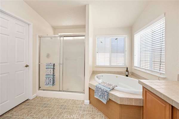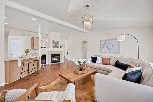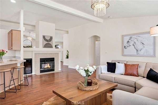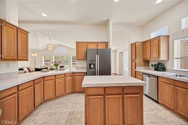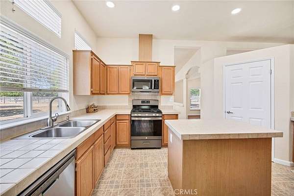 - Beamed Ceilings, Ceiling Fan(s), Entry Slope Less Than 1 Foot, No Interior Steps, Open Floorplan, Tile Counters