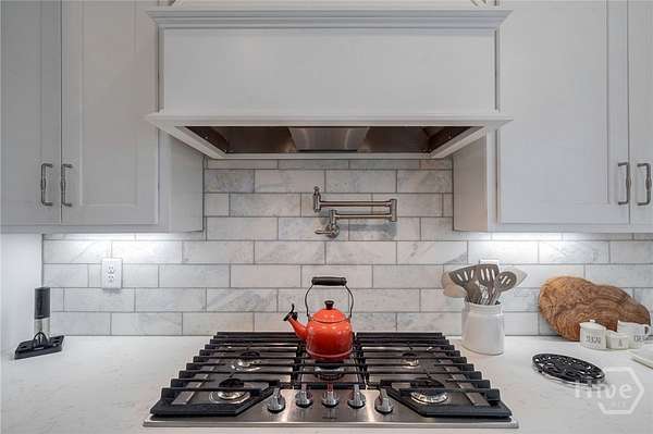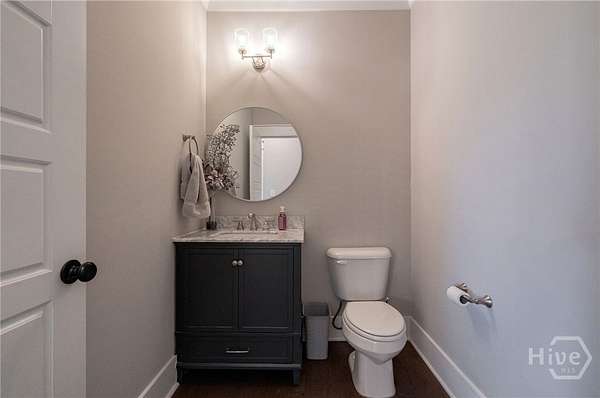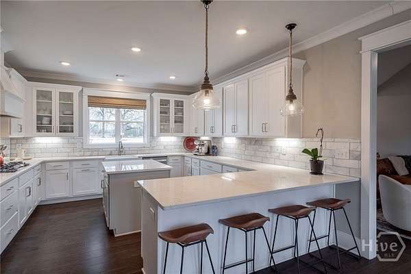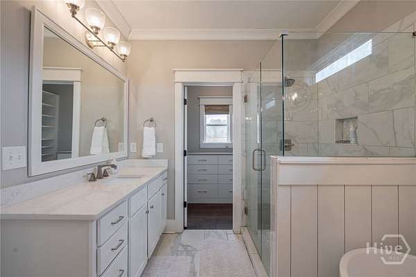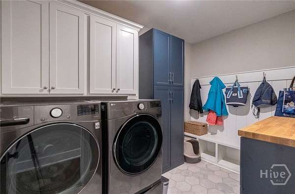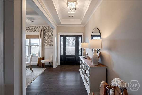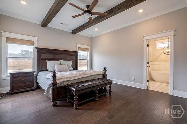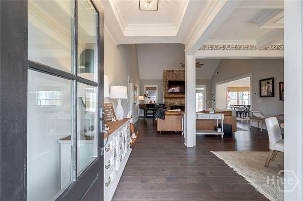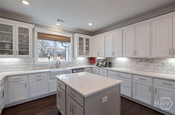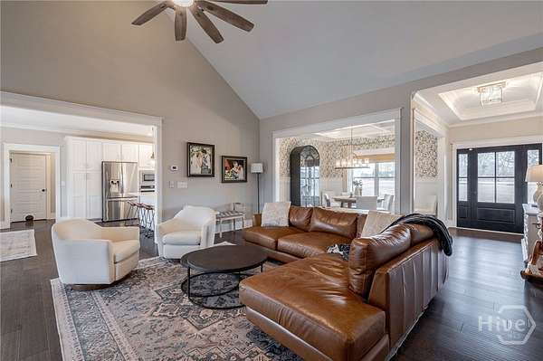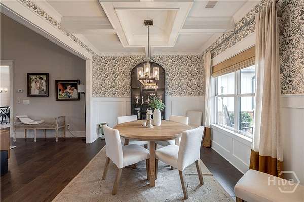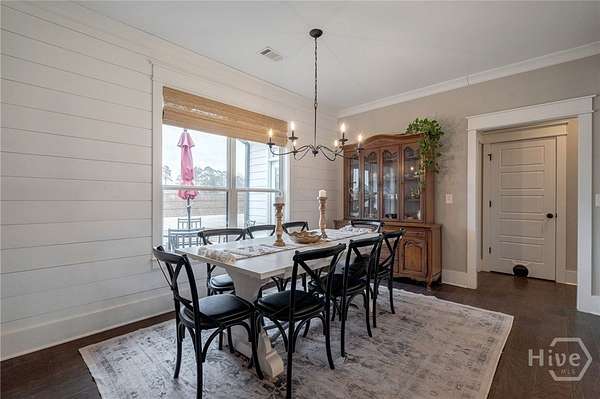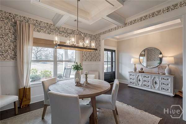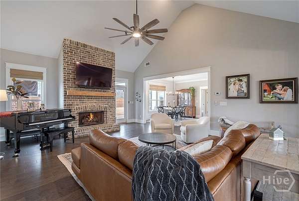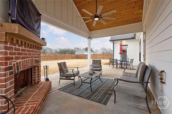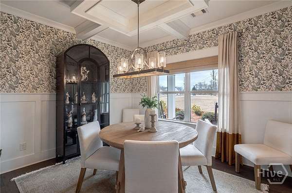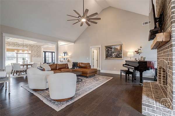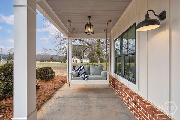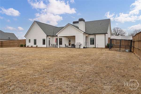 Stunning Modern Farmhouse on 2 Acres in Good Hope, GA with sweeping country views. This light-filled home blends timeless charm with elevated design, starting with a show-stopping white kitchen made for gathering. Features include a large quartz island, two-toned cabinetry with glass upper accents, apron sink, gas cooktop with pot filler, wood vent hood, stainless steel appliances, and a Carrara marble backsplash. The open family room with vaulted ceilings flows seamlessly into the dining area, anchored by a dramatic floor-to-ceiling fireplace with a reclaimed beechwood mantel. The dining room showcases a unique coffered ceiling design that adds architectural interest. The primary suite on the main level offers wood-beam ceilings and a spa-like bath with dual vanities, soaking tub, walk-in shower, and a custom closet. A split bedroom plan provides privacy, while a bonus/flex room or optional fourth bedroom with a full bath upstairs adds versatility. Thoughtful details throughout include shiplap accents, 5" hardwood floors on the main level, and a spacious mudroom/laundry with excellent storage. Outdoor living shines with a covered back porch featuring a vaulted wood ceiling, outdoor fireplace, TV wiring, and a gas line ready for a grill or future outdoor kitchen. Curated exterior details include black windows, charming corbels, a haint blue front porch ceiling, irrigation, and lush landscaping-creating a truly inviting modern farmhouse retreat.