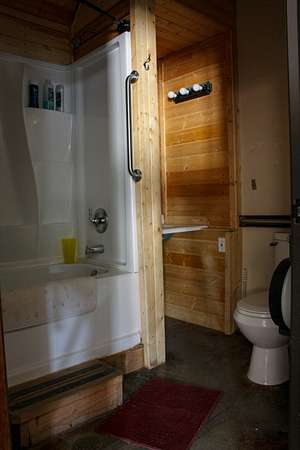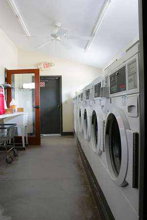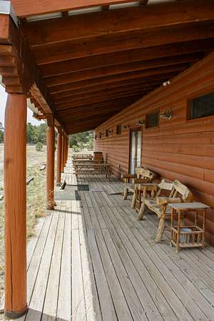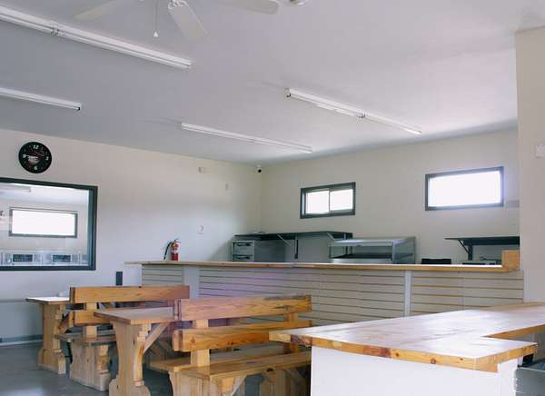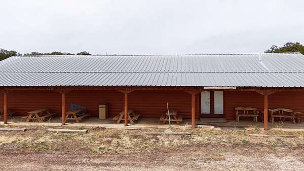 The Outpost building is a +/-3485 sq ft, well-maintained commercial structure formerly operated as a restaurant and trading post. It includes a commercial kitchen, indoor dining space with rustic wooden tables and benches, two restrooms, one of which includes a shower. The laundry area features commercial-grade washers and dryers, folding stations, and a separate exterior entrance. A manager's office is conveniently positioned in the center of the building. The front of the building is covered by a full-length porch with picnic tables and custom log furniture.