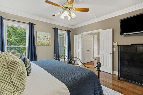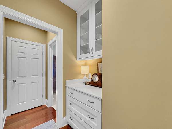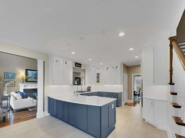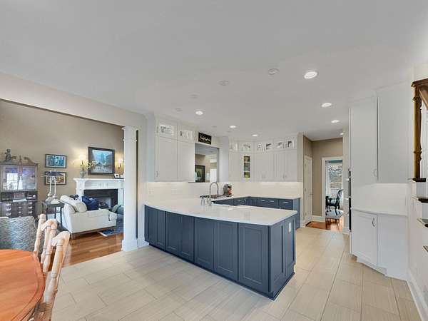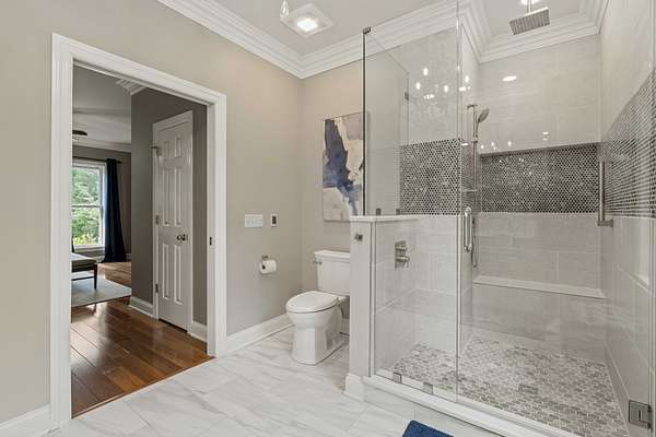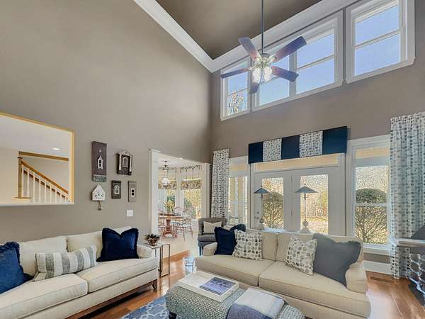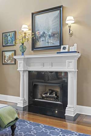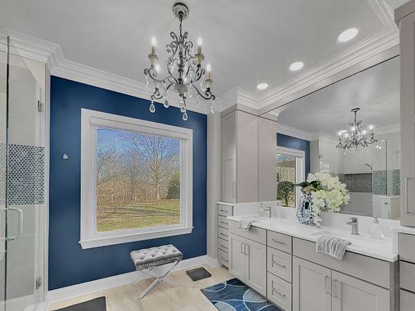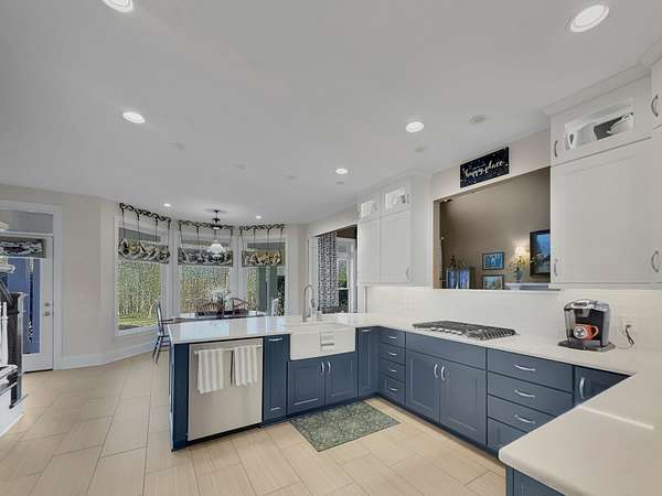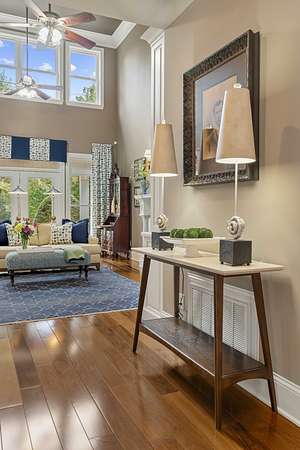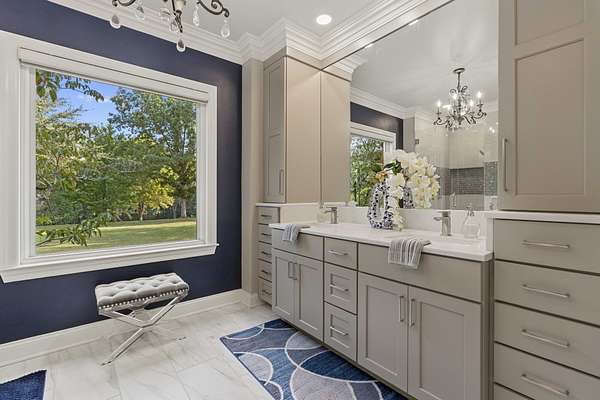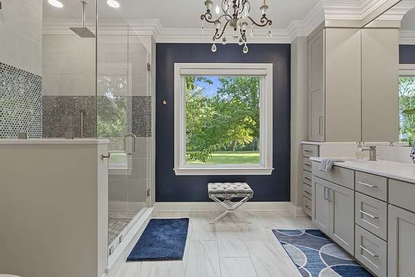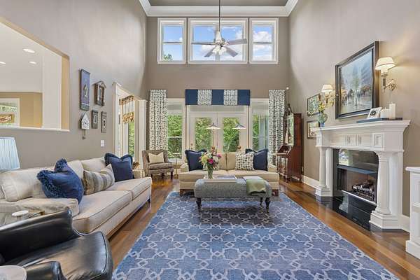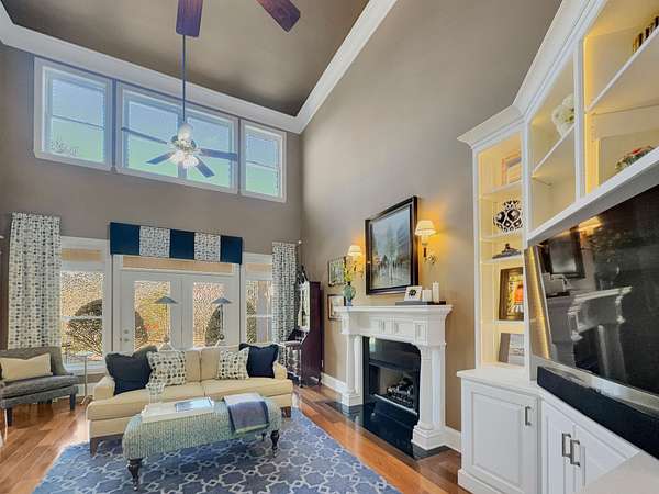The primary suite offers a luxurious retreat with a fully updated bathroom, including a custom tile walk-in shower, heated floors, double-sink vanity, double tailored walk-in closets. The great room impresses with built-in lighted cabinetry, soaring ceiling and windows, a cozy fireplace, creating a warm and inviting atmosphere.