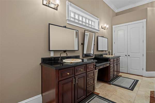 - Built-In Features, Ceiling Fans(s), Crown Molding, Eat-In Kitchen, High Ceilings, Kitchen/Family Room Combo, Primary Bedroom Upstairs, Solid Wood Cabinets, Split Bedroom, Stone Counters, Thermostat, Tray Ceiling(s), Walk-In Closet(s), Wet Bar, Window Treatments