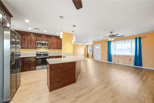 Built in 2021, this beautiful 2BD/1 3/4 BA home offers 1,367 sq. ft. on 2.5 fully fenced acres with a 6-ft chain link fence and RV gate. Features include stucco and tile construction, sidewalks along side the home, covered front and back patios, and stunning mountain views. Inside boasts an open kitchen with quartz countertops, stainless steel appliances custom cabinets, and breakfast bar, plus luxury vinyl flooring and a wood-burning fireplace. The primary bath is handicap-accessible with a roll-in shower. Well was drilled in 2020 with septic put in 2021 with 1250 gallon tank. An oversized 2-car garage provides ample space, with room to add your dream main house, RV garage, or barn. Perfect as a primary home or a place to live while building your forever home!