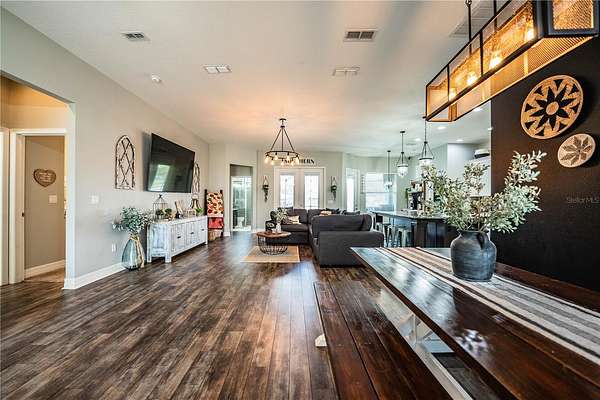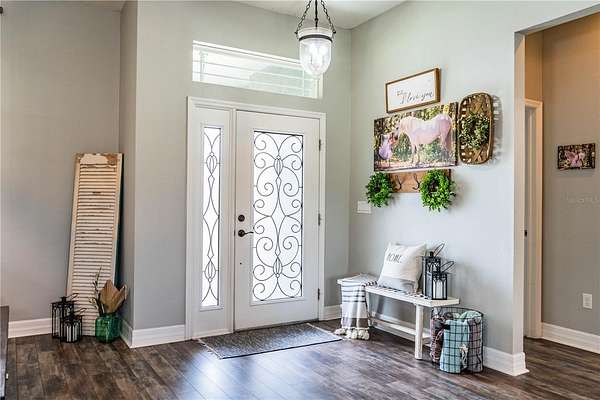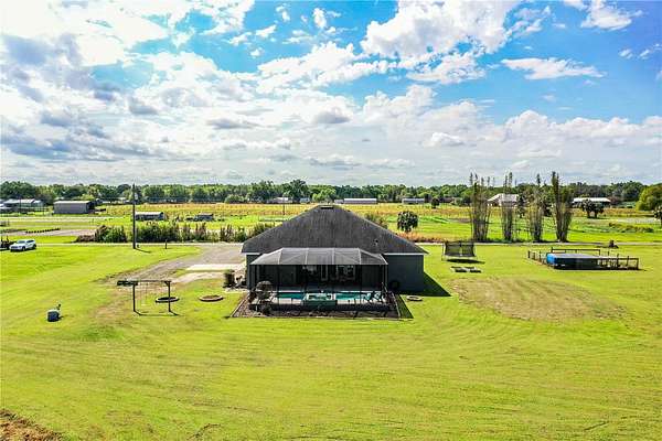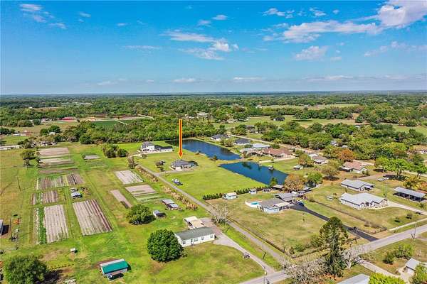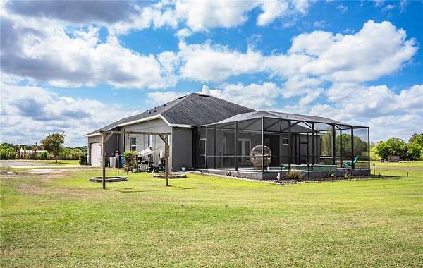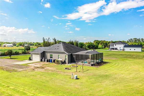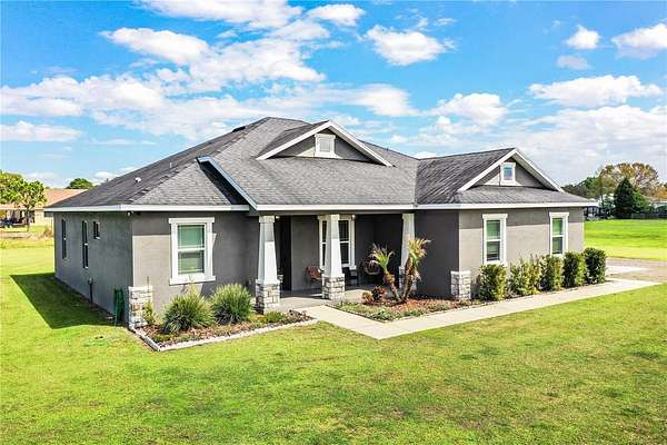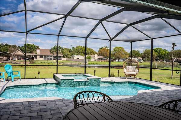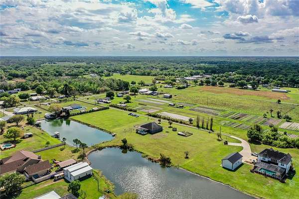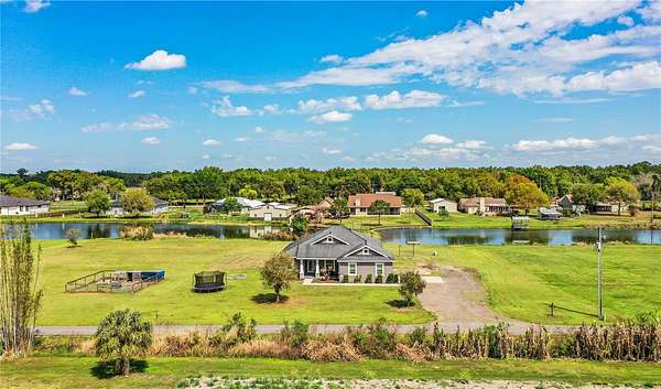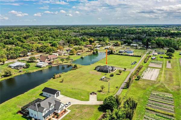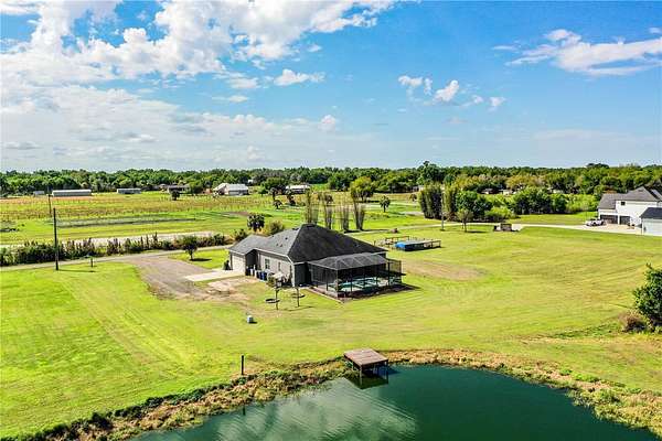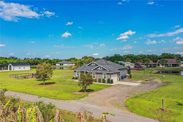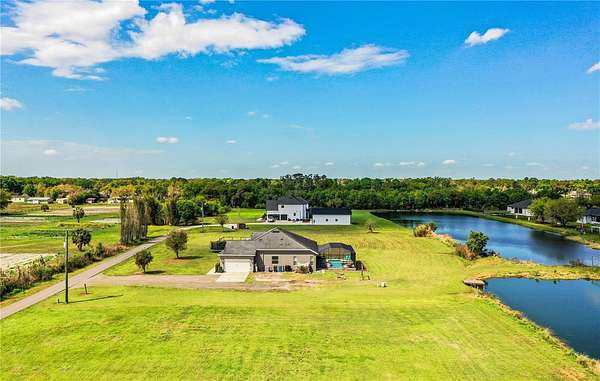 Welcome home to this beautifully maintained custom-built pool home, constructed in 2017, and perfectly situated on a 2-acre lot with room to roam, and views and frontage of 2 separate large ponds. Enjoy peaceful mornings or relaxing evenings fishing right from your private dock. As you approach the property, the home’s excellent curb appeal immediately stands out, along with the abundance of space for boats, RVs (with a 50-amp hookup), and additional vehicles. The property also features a convenient side-entry two-car garage. A welcoming front porch and custom front entry door lead you inside, where you’ll find updated laminate flooring flowing throughout the main living areas, with tile flooring in the bathrooms and utility room. The home offers high ceilings, double-pane windows, and a spacious open-concept great room where the living room, dining area, and kitchen blend seamlessly for comfortable living and entertaining. The split-bedroom floor plan provides privacy, with the primary suite located on one side of the home and two additional bedrooms plus a den/office on the opposite side. The office can easily serve as a fourth bedroom with the addition of a closet. The chef-inspired kitchen features granite countertops, abundant cabinetry and workspace, a large cooking island with sink, stainless steel appliances, skylights, a breakfast bar, and a perfectly positioned dinette area overlooking the living space. The spacious primary suite accommodates large furnishings and includes direct access to the back lanai and pool area. The en-suite bathroom offers a tiled walk-in shower, garden tub, granite vanity with dual sinks, and a large walk-in closet. Outdoor living is a highlight of this property. The screened pool and patio area is accessible through four exterior doors, including double doors with built-in blinds from the great room. The fully pavered lanai features a covered seating area and a heated saltwater pool and spa with color-changing LED lighting, creating the perfect space for year-round enjoyment. Additional features include an EV charger in the garage, a water softener and filtration system, a fenced chicken coop, exterior lighting, and no HOA restrictions. This immaculately maintained, move-in-ready home offers privacy, space, and waterfront living while still being conveniently accessible. Schedule your private showing today!
