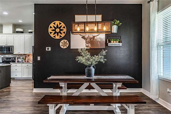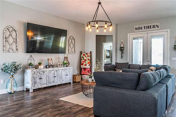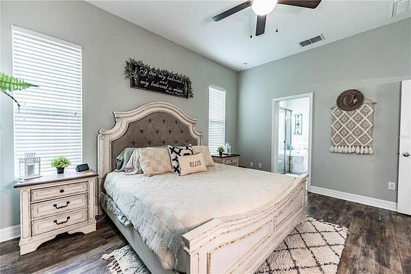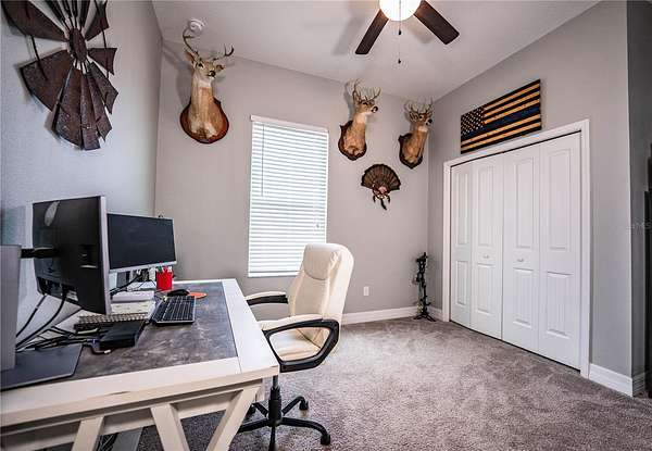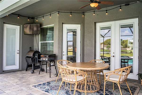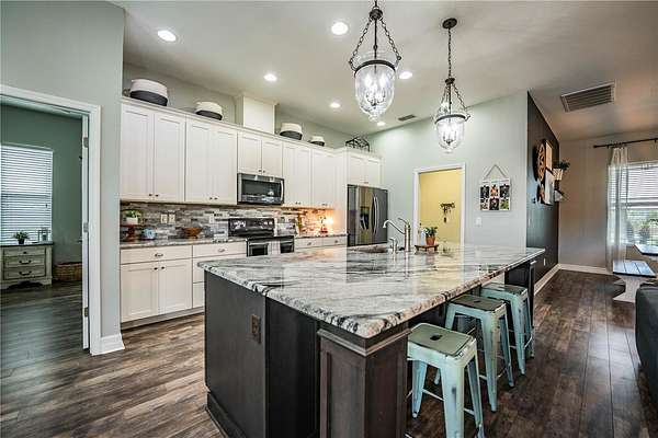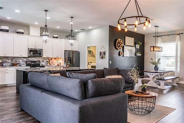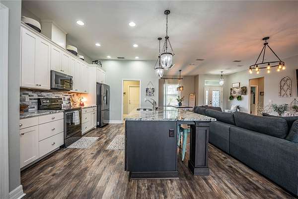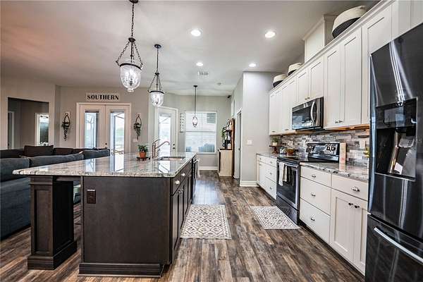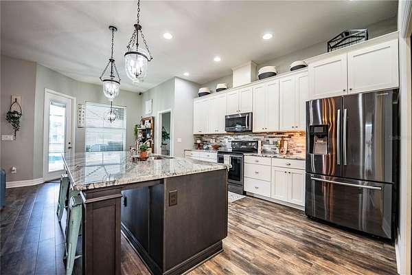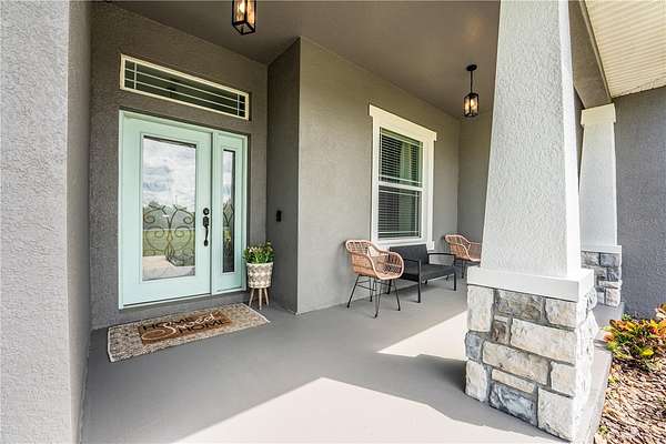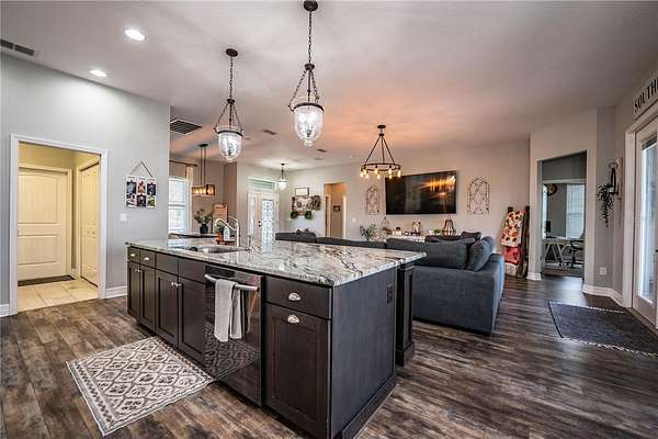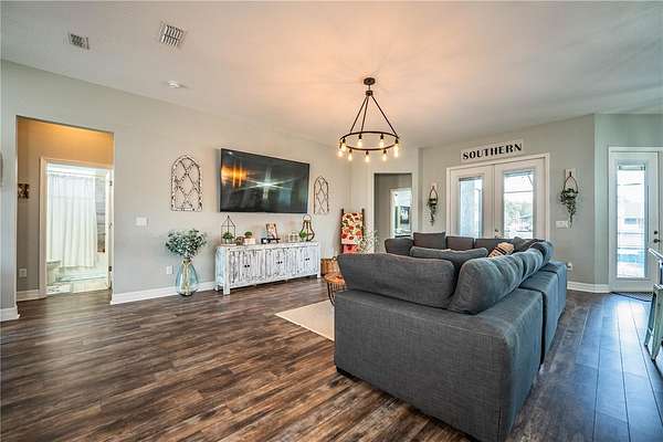 Welcome home to this beautifully maintained custom-built pool home, constructed in 2017, and perfectly situated on a 2-acre lot with room to roam, and views and frontage of 2 separate large ponds. Enjoy peaceful mornings or relaxing evenings fishing right from your private dock. As you approach the property, the home’s excellent curb appeal immediately stands out, along with the abundance of space for boats, RVs (with a 50-amp hookup), and additional vehicles. The property also features a convenient side-entry two-car garage. A welcoming front porch and custom front entry door lead you inside, where you’ll find updated laminate flooring flowing throughout the main living areas, with tile flooring in the bathrooms and utility room. The home offers high ceilings, double-pane windows, and a spacious open-concept great room where the living room, dining area, and kitchen blend seamlessly for comfortable living and entertaining. The split-bedroom floor plan provides privacy, with the primary suite located on one side of the home and two additional bedrooms plus a den/office on the opposite side. The office can easily serve as a fourth bedroom with the addition of a closet. The chef-inspired kitchen features granite countertops, abundant cabinetry and workspace, a large cooking island with sink, stainless steel appliances, skylights, a breakfast bar, and a perfectly positioned dinette area overlooking the living space. The spacious primary suite accommodates large furnishings and includes direct access to the back lanai and pool area. The en-suite bathroom offers a tiled walk-in shower, garden tub, granite vanity with dual sinks, and a large walk-in closet. Outdoor living is a highlight of this property. The screened pool and patio area is accessible through four exterior doors, including double doors with built-in blinds from the great room. The fully pavered lanai features a covered seating area and a heated saltwater pool and spa with color-changing LED lighting, creating the perfect space for year-round enjoyment. Additional features include an EV charger in the garage, a water softener and filtration system, a fenced chicken coop, exterior lighting, and no HOA restrictions. This immaculately maintained, move-in-ready home offers privacy, space, and waterfront living while still being conveniently accessible. Schedule your private showing today!