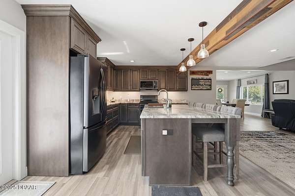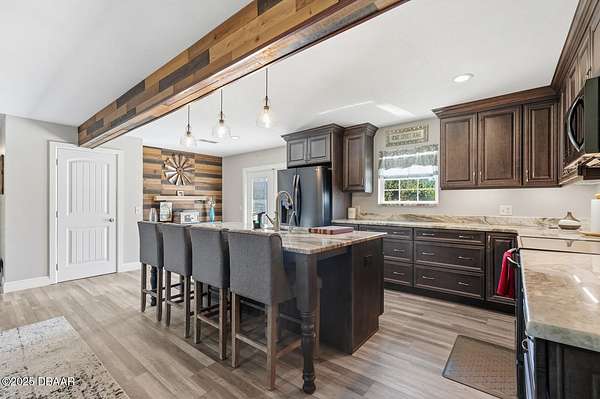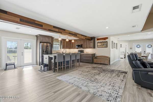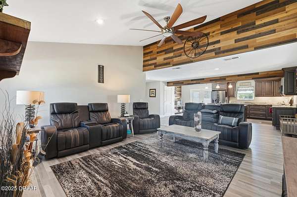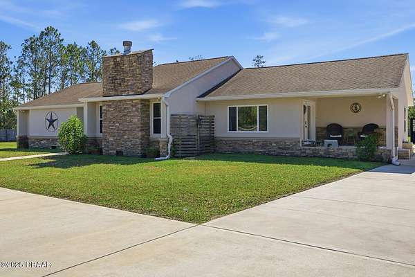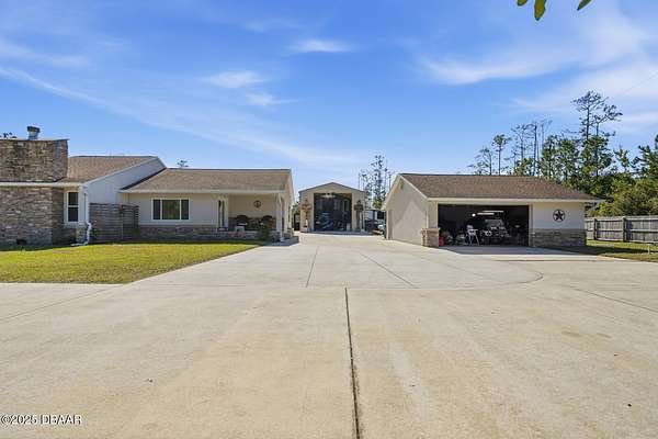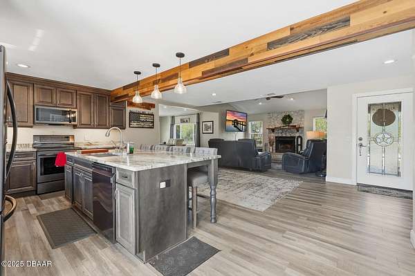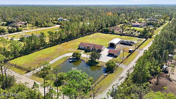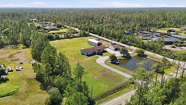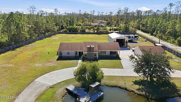 Luxury Country Living in Plantation Pines! Welcome to your dream retreatthis fully upgraded home on 2.25 cleared, fenced acres offers the perfect blend of luxury and tranquility. Behind the electric gate, you'll find a wrap-around driveway, a private pond with fishing dock, and a detached oversized 2-car garage, all surrounded by peaceful country scenery. Step inside to discover brand new LVP flooring, black stainless steel appliances, and a chef's kitchen featuring an oversized island, granite countertops, and custom wood beams. The open-concept living area boasts a cozy fireplace and seamless flow for entertaining. The split floor plan provides privacy, with the primary suite offering French doors that overlook the backyard, a remodeled ensuite with a walk-in shower, double vanity, and a spacious walk-in closet. Guest bedrooms feature new carpet and padding for comfort and style. Relax on the covered front porch, perfect for rocking chairs and morning coffee. Major updates include a new roof and HVAC (2020) and a tankless water heater for efficiency. Outside, you'll find an impressive 24x56 fully insulated pull-through metal building with roller doors on both endsideal for an RV, boat, or workshop. Upstairs, a 576 sq. ft. climate-controlled bonus room with mini-split AC and upgraded vinyl flooring provides endless possibilitieshost gatherings, set up a game room, or create the perfect guest retreat. Additional features include a double gate for trailer/boat/RV parking, separate septic tank, and dedicated electric hookup. This unicorn property combines luxury country living with unbeatable conveniencejust minutes from shopping, dining, and entertainment. Don't miss this rare opportunity to own your piece of paradise in Plantation Pines!