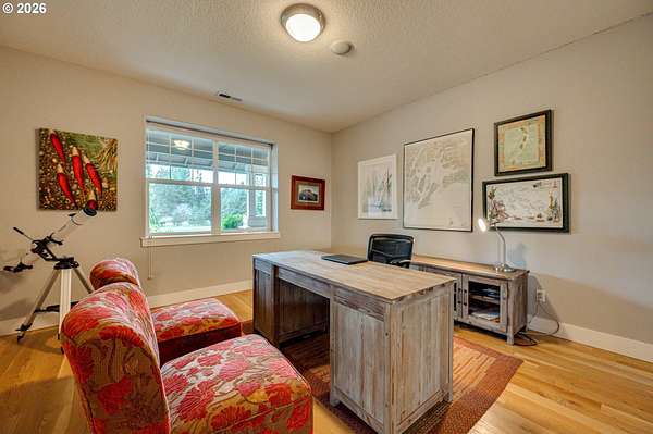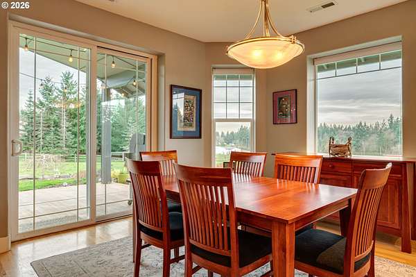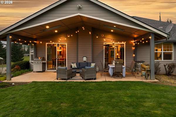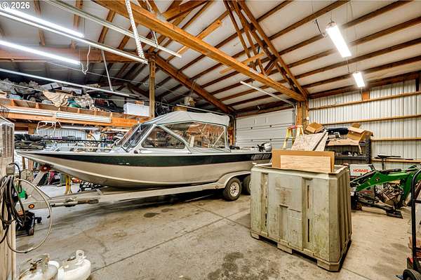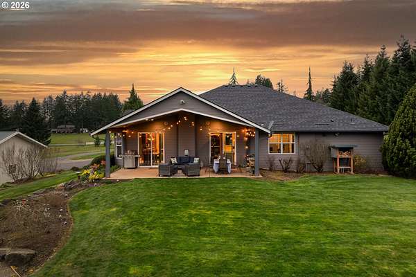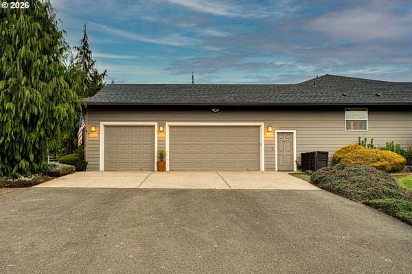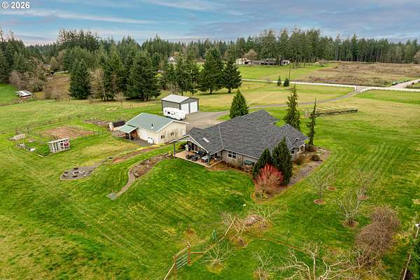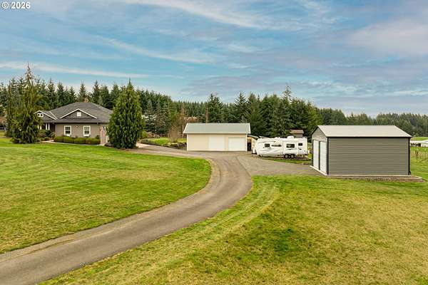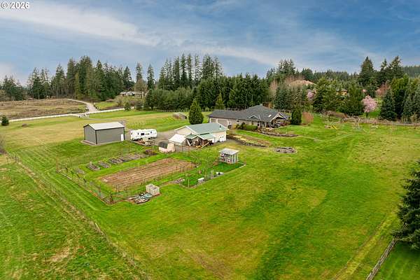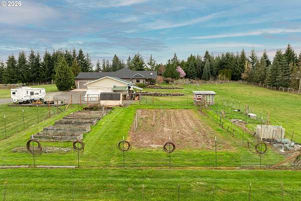 Hobby farmer's dream with HUGE shops on 5 level acres. The 34x38 shop includes pull through access, hot water, and workshop space, plus an additional 32x32 shop. Beautifully updated great room floorplan featuring quartz counters, a spacious island, walk-in pantry with garage passthrough, and hardwood floors throughout. Two sliders open to the oversized covered patio for easy indoor-outdoor living, and an amazing firepit area for stargazing. The primary suite offers a spa like bath with soaking tub, roll in tile shower, heated tile floors, and walk-in closet. The property is set up for country living with a deer fenced garden, raised beds, drainage, drip irrigation, solar heated greenhouse, orchard, Mason bee colonies, chicken coop, duck habitat, and blueberries. Energy efficient features include ICF construction, heat pump, emergency generator, new roof, and Hardi-plank siding. Attached three car garage with EV readiness, mechanical room, and extensive paved parking. Fully fenced with gated entry. This one won't last!