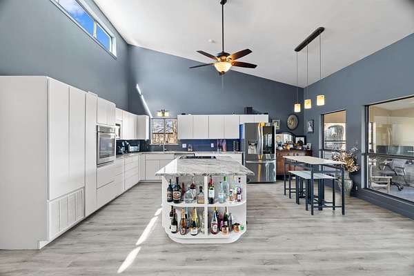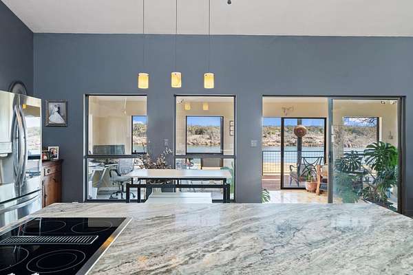 Exceptional waterfront property on Lake Marble Falls, offering approximately 1.5 acres and roughly 100 feet of constant-level shoreline. A solid bulkhead provides direct lake access, ideal for swimming, kayaking, paddleboarding, or the future addition of a private dock. Mature pecan trees and natural landscaping create a private, serene setting, enhanced by an eight-foot privacy fence. Tucked away on a quiet dead-end street and a no-HOA neighborhood, the property offers privacy and flexibility rarely found on the lake. This stunning 3-bedroom, 2.5-bath home is filled with abundant natural light and showcases lake views from every room. An expansive covered deck invites relaxed entertaining, sunrise coffees, and sunset evenings overlooking the water. A dedicated office is thoughtfully positioned to capture peaceful lake views, often accompanied by visiting deer - creating an inspiring and tranquil workspace. A detached workshop provides ample room for lake toys, hobbies, or additional storage. Located within a welcoming lakeside community just minutes from shopping and dining, this property offers a rare blend of privacy, ease of living, and constant-level waterfront enjoyment - ideal for use as a primary residence, weekend escape, or potential short-term rental lake retreat. Schedule your private tour today!