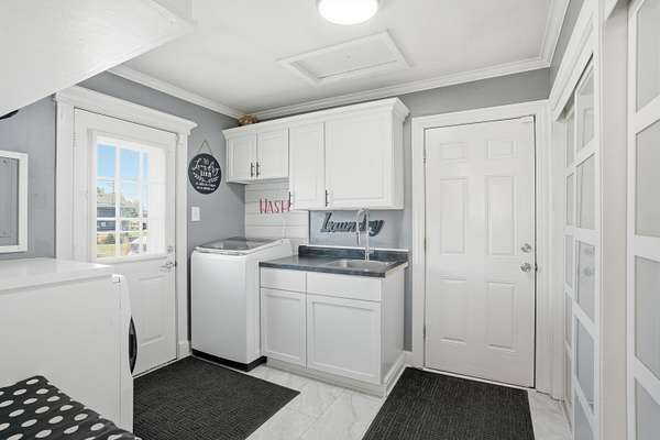 Escape the ordinary -- where modern farmhouse comfort meets wide-open space. Set on a rare 2.5-acre property, this single-story ranch offers room to breathe, grow, and enjoy life at your own pace. Inside, nearly 1,800 square feet of thoughtfully designed living space welcomes you with warmth and style. The inviting living room centers around a wood-burning fireplace, while the planked ceiling and glass-panel doors in the primary bedroom add rustic elegance. The updated bath features a dual-sink vanity and tiled shower/tub combo, blending charm with convenience. The kitchen is bright and spacious with stainless steel appliances and plenty of counter space for everyday cooking or weekend entertaining. A generous 17x22 flex room offers endless potential--game room, office, studio, or additional family space. Outdoors, the possibilities are even greater. The expansive 2.5-acre yard offers privacy, a mix of open green space and mature trees, and plenty of room for gardening, gatherings, or even future outbuildings. Enjoy summer days by the above-ground pool, unwind on the patio, or relax on the covered front porch as you take in the peaceful surroundings. Extras include an attached garage, two storage sheds, and a mudroom/laundry area with built-in benches and storage. Located just minutes from downtown Crown Point's shops, restaurants, and parks, yet tucked away enough to feel like your own private retreat. Experience the best of both worlds -- modern living with a country feel -- at this one-of-a-kind property on 2.5 acres in Crown Point.