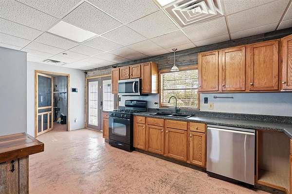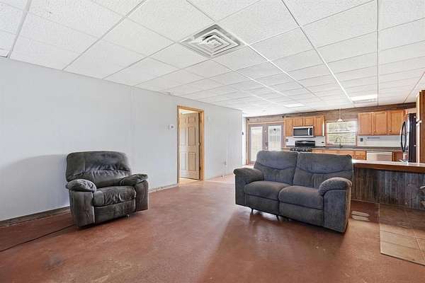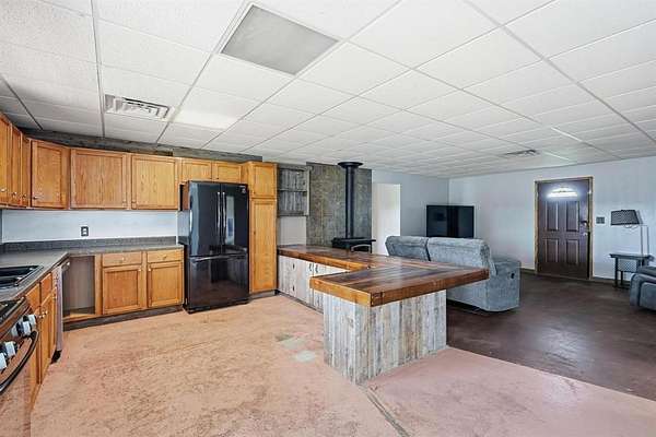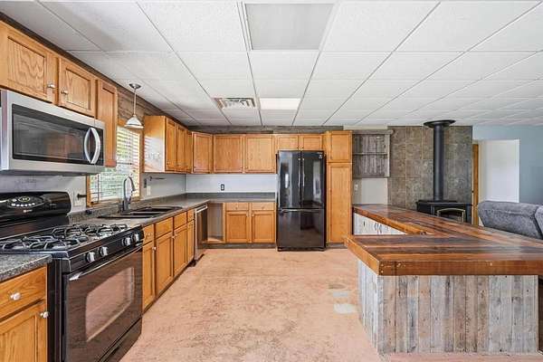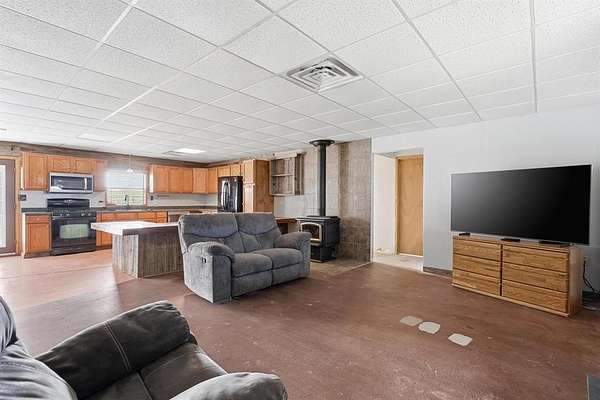 Welcome to this charming 3-bedroom, 2-bath barndominium-style home offering the perfect blend of comfort and country living. Designed with an open-concept layout, the home features a spacious living area centered around a cozy wood-burning stove, creating a warm and inviting atmosphere.