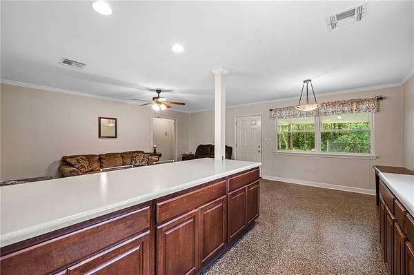 The kitchen offers a sit-at bar that flows into the main living area. Step outside to a covered back patio. Large pump house and shed for extra storage.