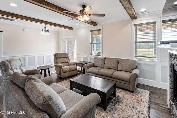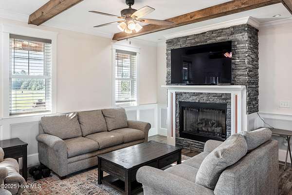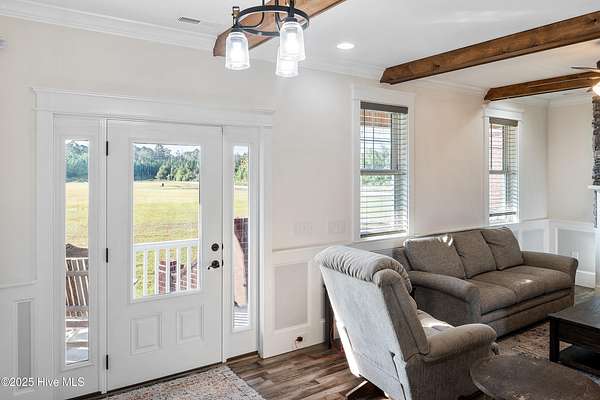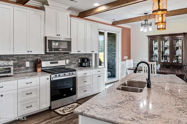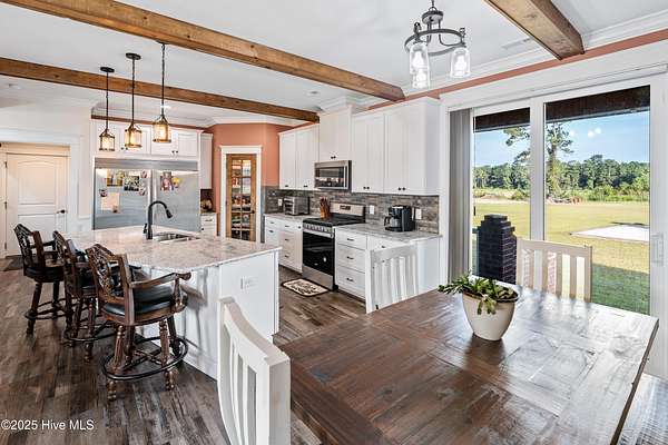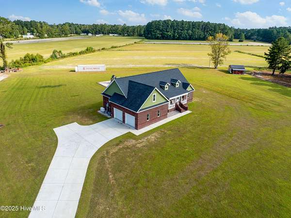 Welcome to this stunning custom-built brick estate, perfectly situated on 10 acres of private land with no HOA. Step through the front door and you'll immediately be captivated by the striking beams that flow seamlessly from the open-concept living room into the kitchen and dining area, creating a warm and inviting atmosphere. Anchoring the living room is a beautiful stone fireplace, offering the perfect focal point for gatherings. The chef's kitchen is thoughtfully designed with an oversized island, granite countertops, and a spacious walk-in pantry-ideal for everyday living and entertaining alike. The floor plan provides balance and privacy with two bedrooms and a full bath on one side of the home, while the owner's retreat occupies the other. The primary suite features a trey ceiling adorned with decorative beams, a spa-like bathroom with dual vanities, a soaking tub, a walk-in shower, and a generous closet. A convenient laundry/mudroom completes the first floor. Upstairs, you'll find a versatile bonus/bedroom/flex room, an additional full bathroom, and a walk-in attic that provides excellent storage or the potential for future expansion. For peace of mind, the home is equipped with a propane-powered whole-house generator. Outside, the possibilities are endless across 10 sprawling acres. With no HOA restrictions, you truly have the flexibility to make it your own. This property is a rare blend of refined craftsmanship, modern convenience, and wide-open space-ready to welcome its next owner.